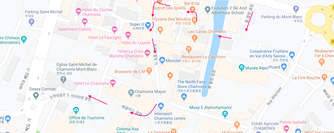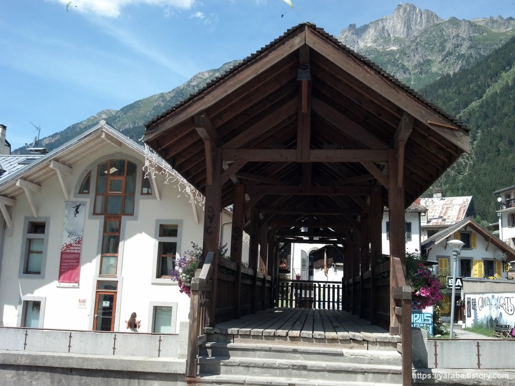 샤모니는 산에 둘러 쌓인 계곡에 위치한 도시로 도시 가운데로는 빙하수가 모여 흐르는 아르브(l'Arve) 강이 남북으로 흐르고 있습니다. 이강을 가로지르는 작은 목조 다리를 건너면 몽블랑 광장에서 시내 중심가로 진입할 수 있습니다.