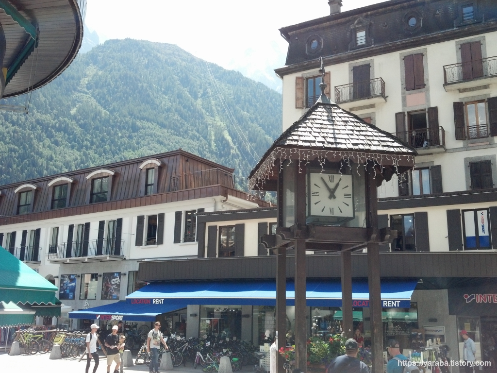 슈퍼마켓에서 쇼핑을 끝낸 저희는 길을 따라 남쪽으로 내려 갑니다. 사진에 보이는 시계탑은 샤모니 시청 근처 교차로에 있는 것입니다. 때마침 점심시간이라 TMB를 시작하는 사람들, TMB를 끝낸 사람들, 그냥 샤모니에 관광 온 사람들이 섞여서 북적북적합니다. 저녁 시간이면 시내는 사람이 더 많아집니다. 인구 1만 명도 되지 않는 프랑스의 시골도 이렇게 사람들로 넘쳐나니 관광 대국 프랑스라는 말이 실감 납니다.