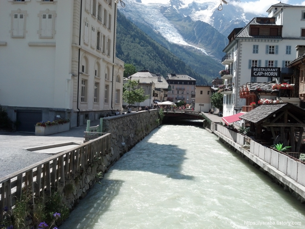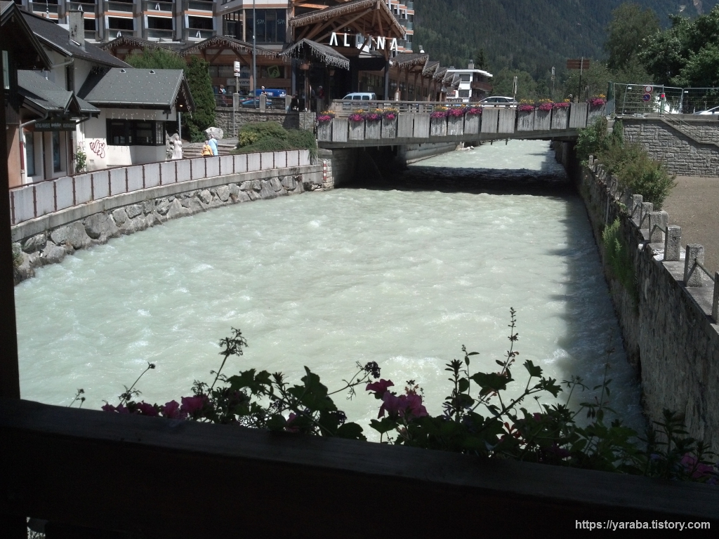 색이 뿌연 빙하수가 콸콸 흘러내려가는데 그 기세가 예사 스럽지 않습니다. 평지처럼 보여도 샤모니는 해발 1천 미터 지대이니 물이 흘러가는 기세가 강한 것이 당연한지도 모르겠습니다.
