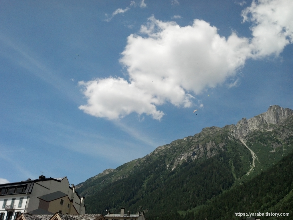 몽블랑 반대편 르 브레방(Le Brévent) 쪽으로는 눈 덮인 고봉들은 보이지 않지만 마치 독수리처럼 하늘을 뱅뱅 돌고 있는 패러 글라이더들이 하늘을 수놓고 있습니다. 르 브레방으로 방향을 잡고 천천히 걸음을 옮깁니다.
