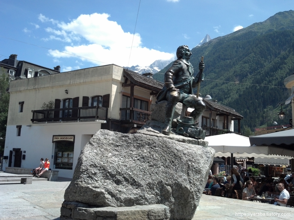 발마 광장에 들어서면 샤모니의 상징과도 같은 오라스 소쉬르와 자크 발마의 동상이 있습니다. 스위스의 과학자이자 등산가인 소쉬르(Horace Bénédict de Saussure)는 몽블랑을 최초로 오른 사람에게 상금을 내건 인물로 1786년 미셸 파카르와 자크 발마가 성공한 다음 1년 후에 자신도 자크 발마와 함께 몽블랑 등정에 성공했다고 합니다.