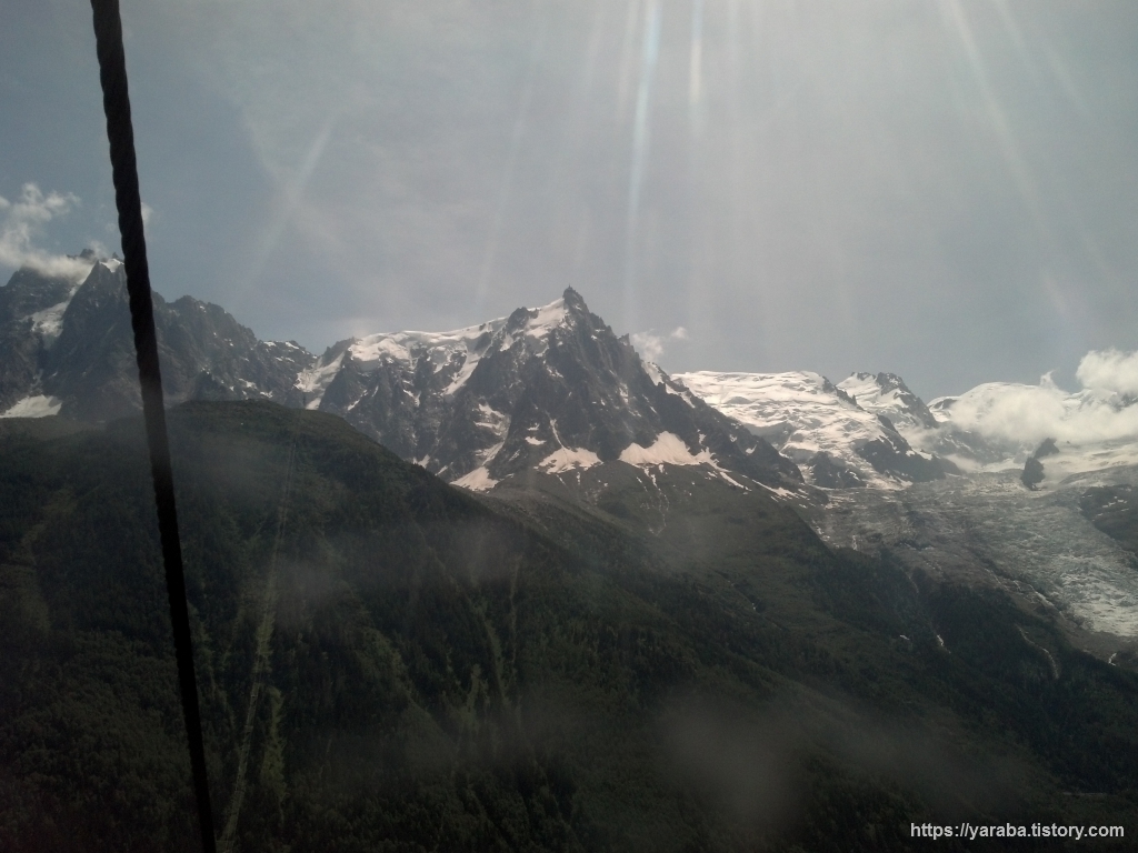 곤돌라에서 바라본 건너편 몽블랑 방면의 모습입니다. 위압감이 느껴지는 빙하와 흰눈이 쌓여 있는 고봉을 넘고 있는 흰구름까지 그야말로 절경입니다.