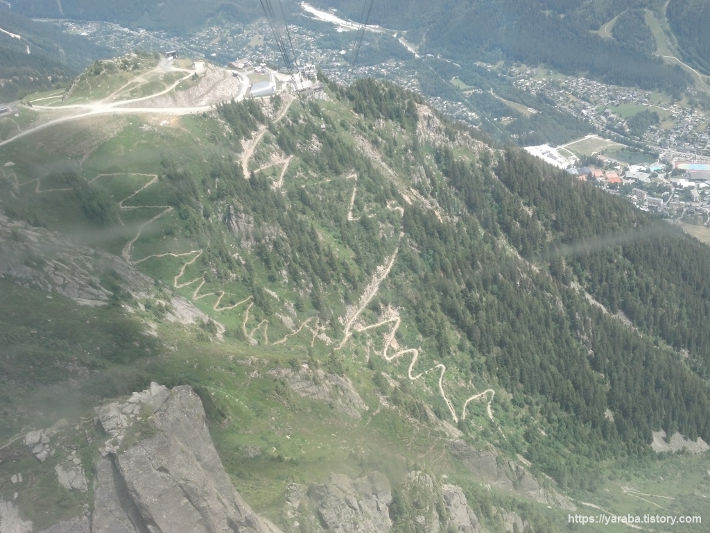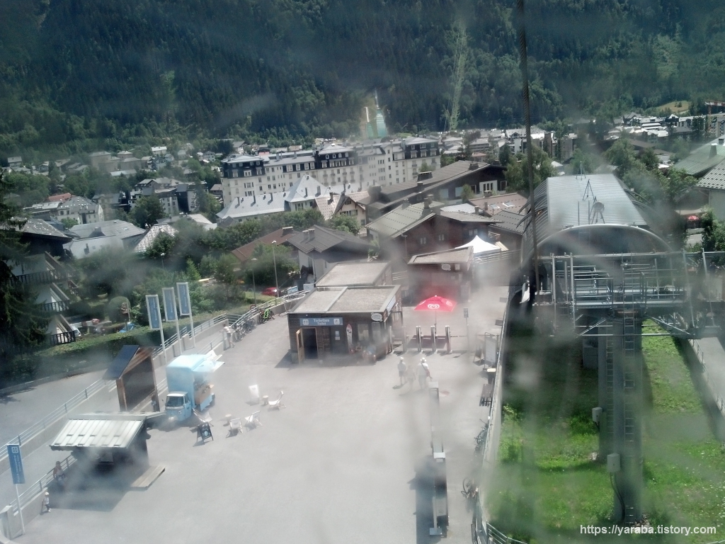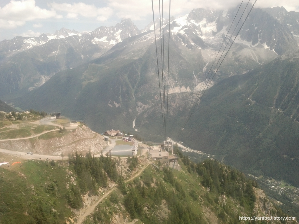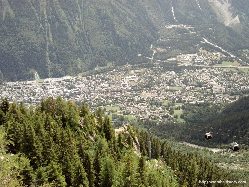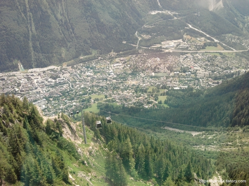 계곡을 가로지르는 케이블카에서 바라보는 샤모니의 풍경은 거칠 것 없는 독특한 스카이뷰를 선사합니다. 곤돌라에서 바라보는 풍경과는 또 다른 맛입니다. 르 브레방 케이블카를 타길 잘했다는 생각이 들었습니다.