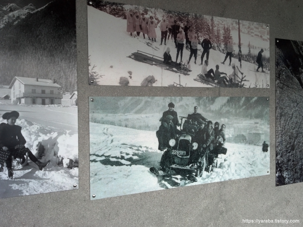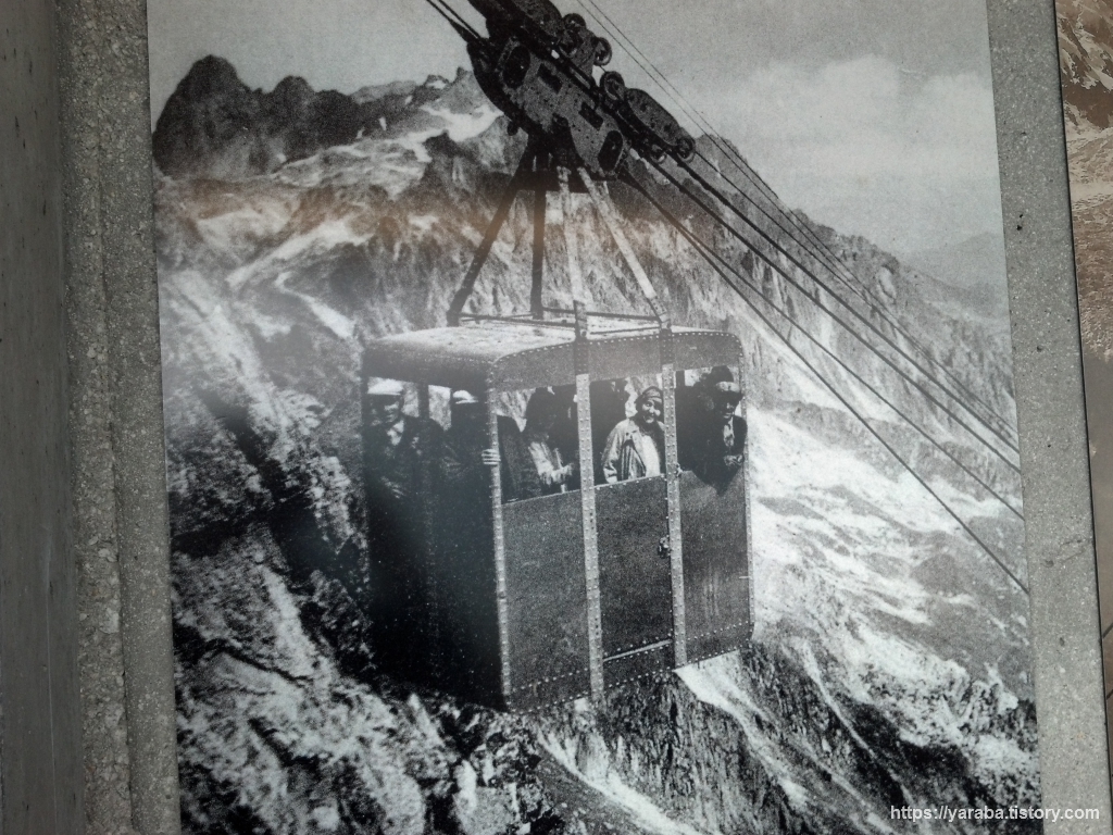 곤돌라에서 내리면 통로를 통해서 케이블카 승차장으로 이동하게 되는데 통로 벽에는 겨울 스포츠의 역사와 곤돌라 및 케이블카의 건설 과정을 살펴볼 수 있는 사진들이 붙어 있었습니다. 삭막하기만 할 수 있는 콘크리트 통로가 마치 작은 박물관 역할을 하고 있었습니다.