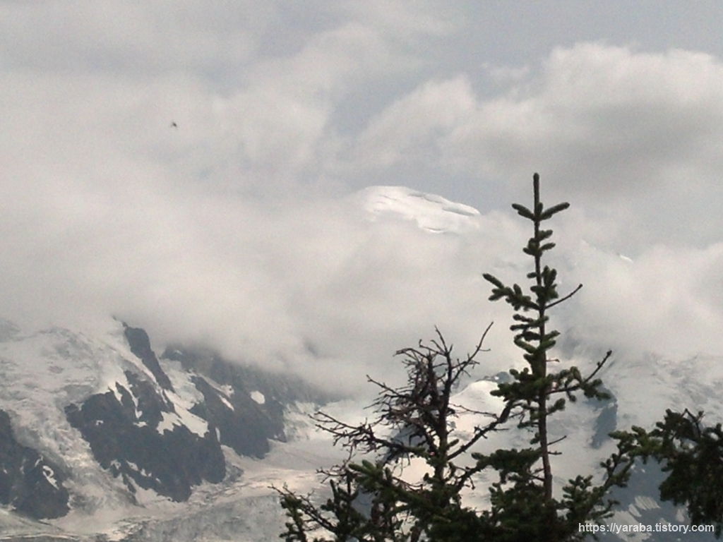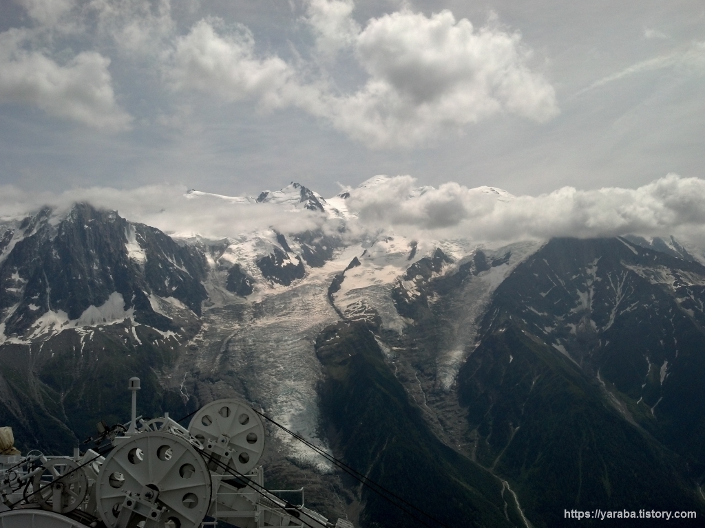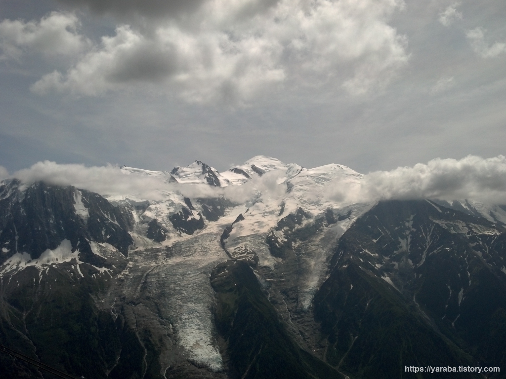 구름 밖으로 나왔다가 구름에 가려진 몽블랑. 날이 흐려서 구름이 더 많거나 안개라도 끼었으면 볼 수 없었을 광경을 마음껏 눈에 담습니다. 케이블카에서 내려 승차장 뒤쪽으로 올라가면 산 정상에서 더 좋은 전경을 감상할 수 있습니다.