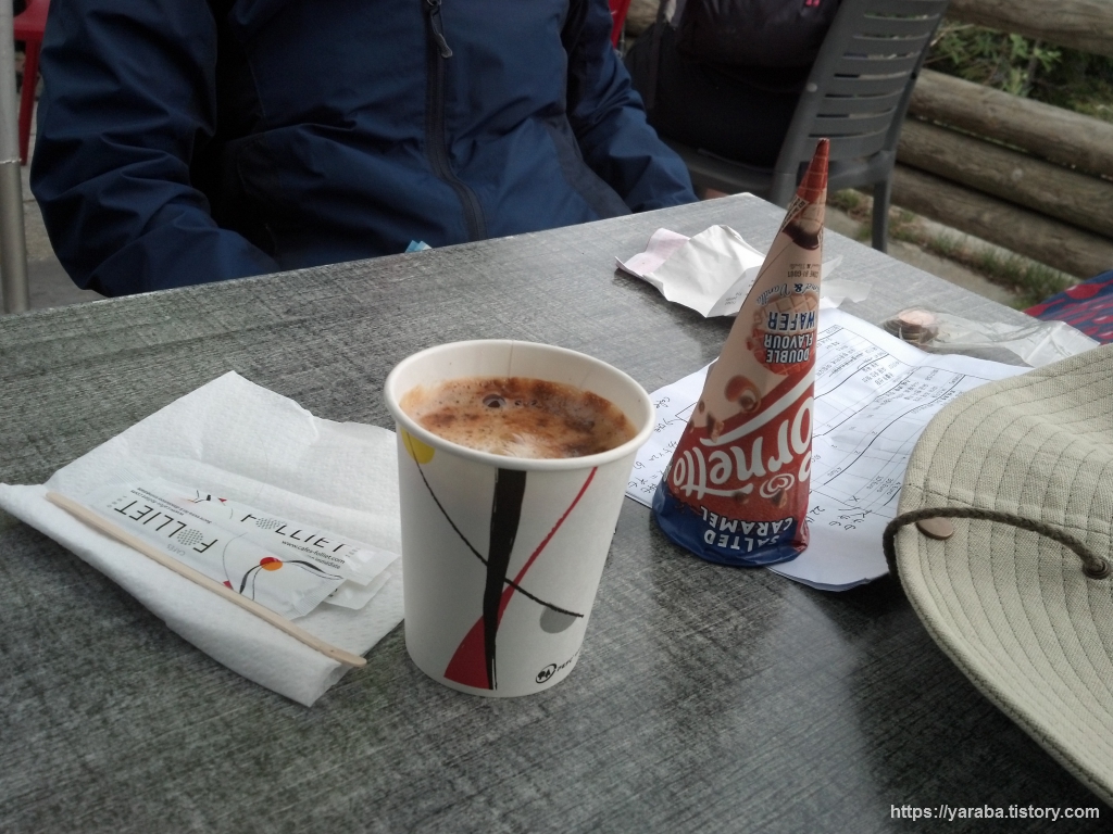 르 브레방 산 정상에서 한동안 신선놀음하며 휴식을 가졌던 저희는 케이블카로 플랑프라(Gares de Planpraz)로 내려와서 스위스 제네바로 출발하는 버스 시간까지 산장에서 편하게 휴식 시간을 갖기로 했습니다. 2천 미터의 고도라 조금은 쌀쌀했지만 커피와 아이스크림으로 즐거운 한때를 보냈습니다. 저희 테이블 바로 옆으로는 중동에서 온 대가족들이 전통 복장 차림으로 간식 시간을 가지고 있었습니다. 그 또한 독특한 풍경이었습니다.