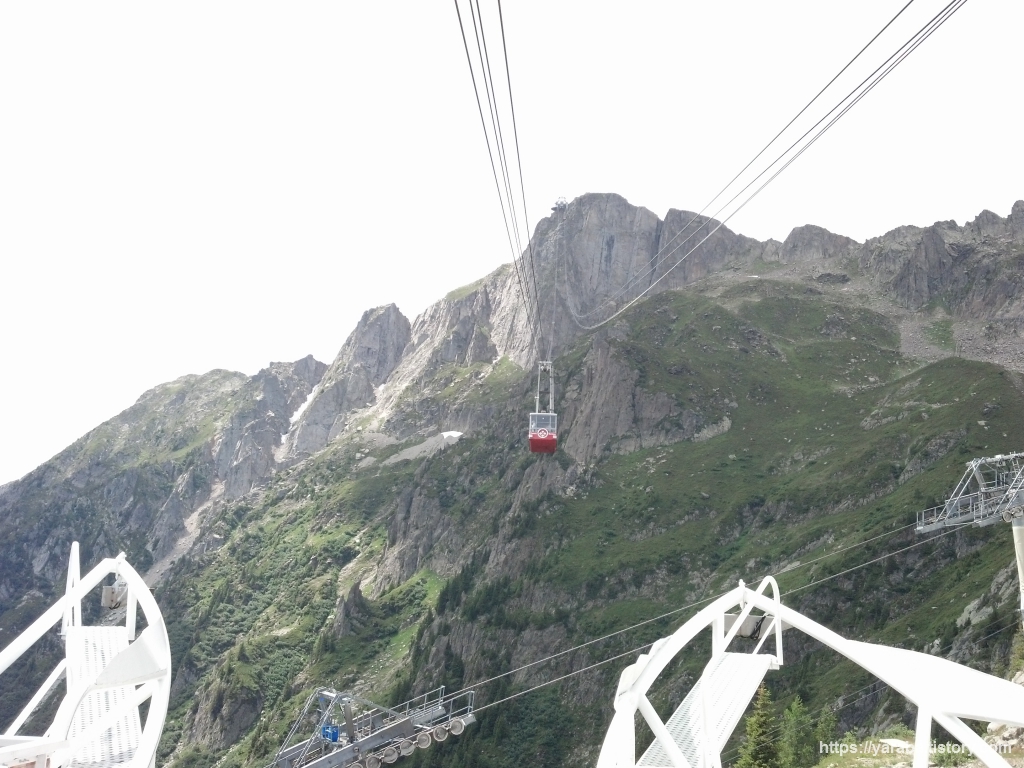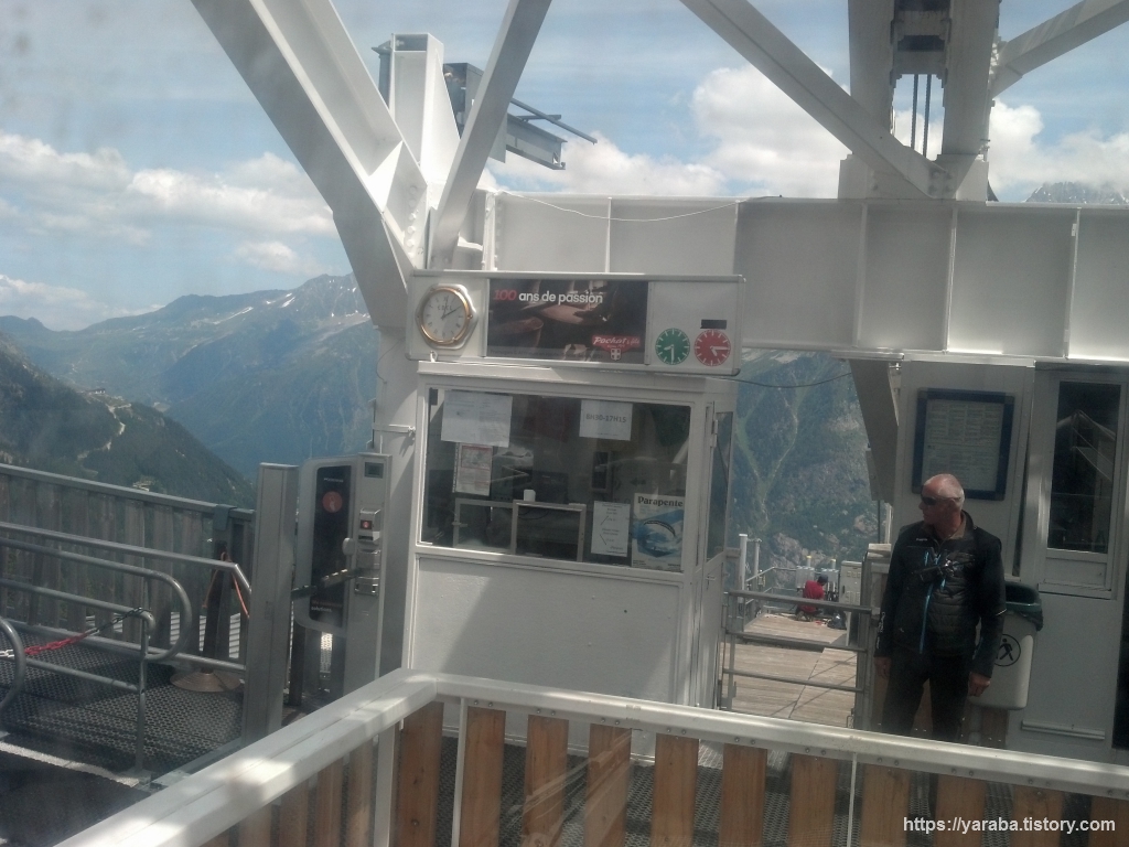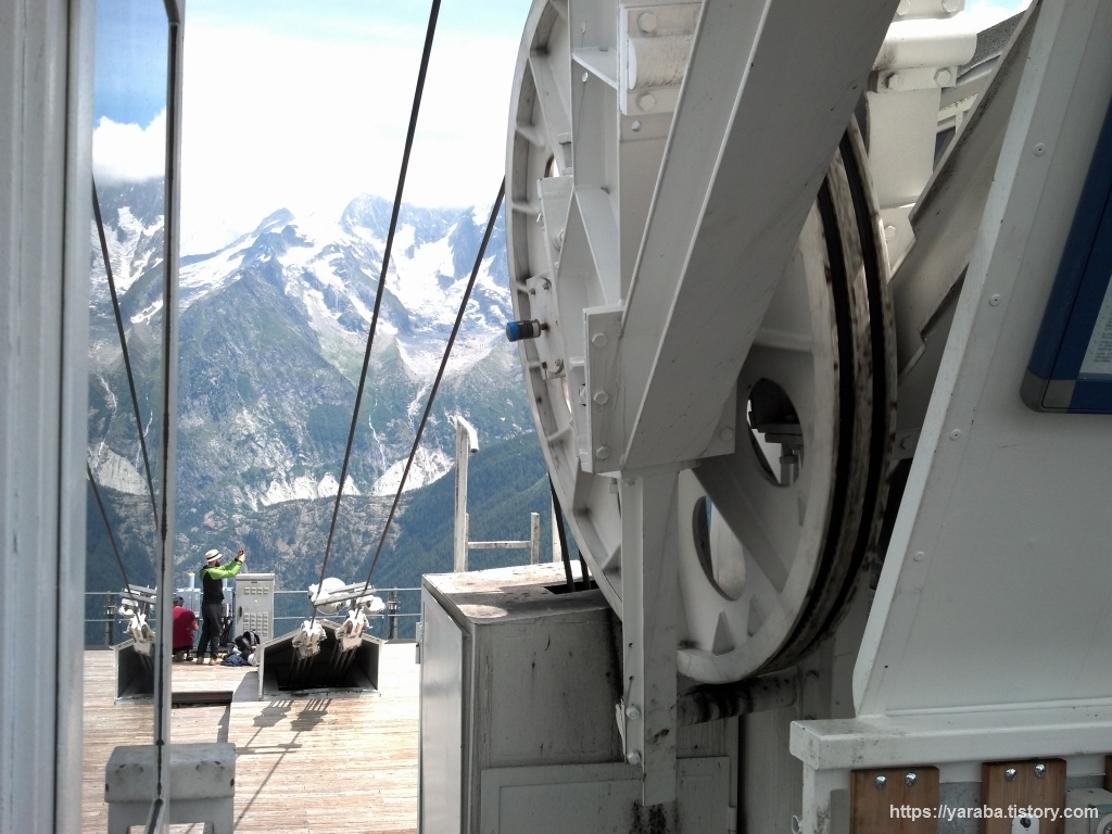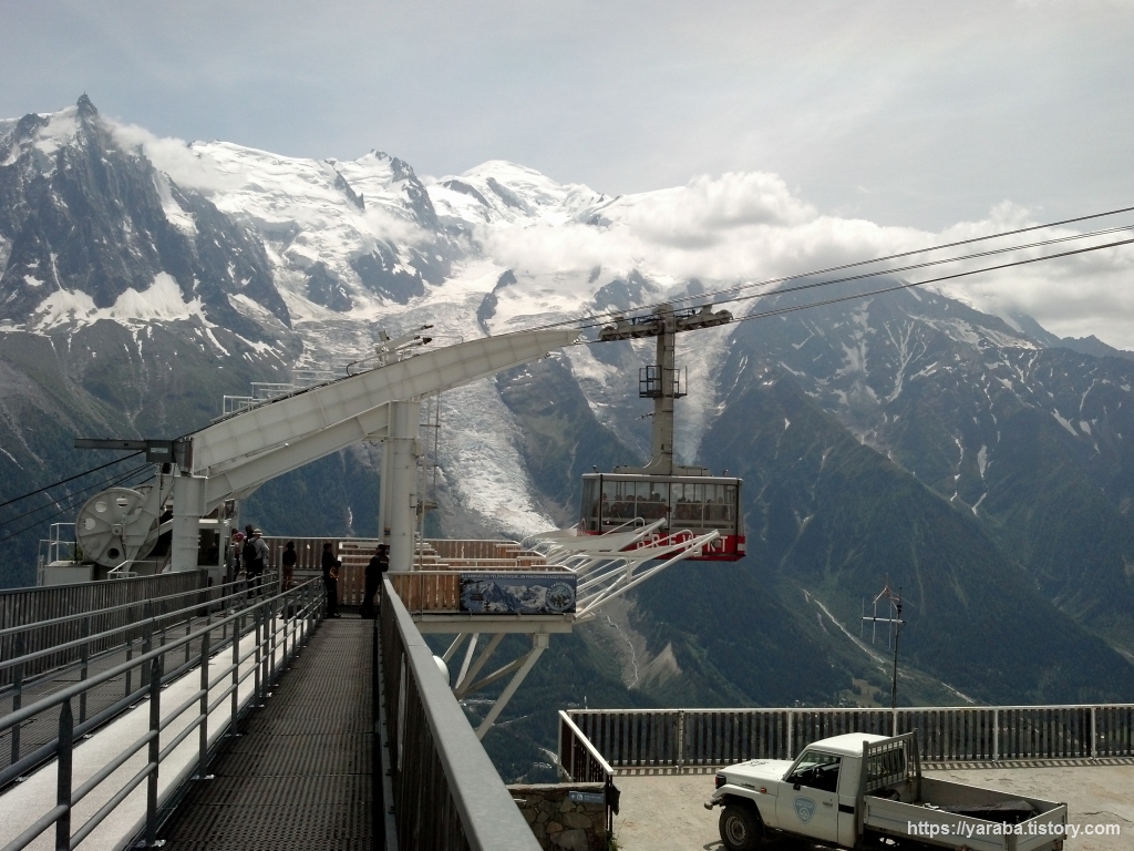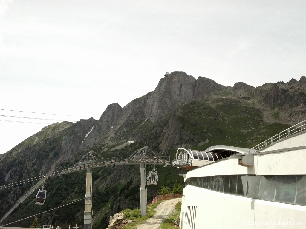 한층 가까워진 빙하와 몽블랑을 배경으로 르 브레방에서 출발한 케이블카가 승차장으로 들어 오고 있습니다. 저 차량에서 사람들이 모두 내리고 나면 저걸 타고 저희는 르 브레방으로 올라갑니다.