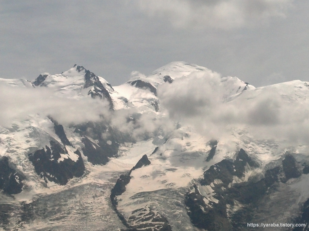 드디어 하얀 봉우리라는 의미의 몽블랑을 제대로 조우합니다. 몽블랑으로 이어진 거대한 빙하는 몽블랑이 입은 갑옷처럼 보이기도 합니다.