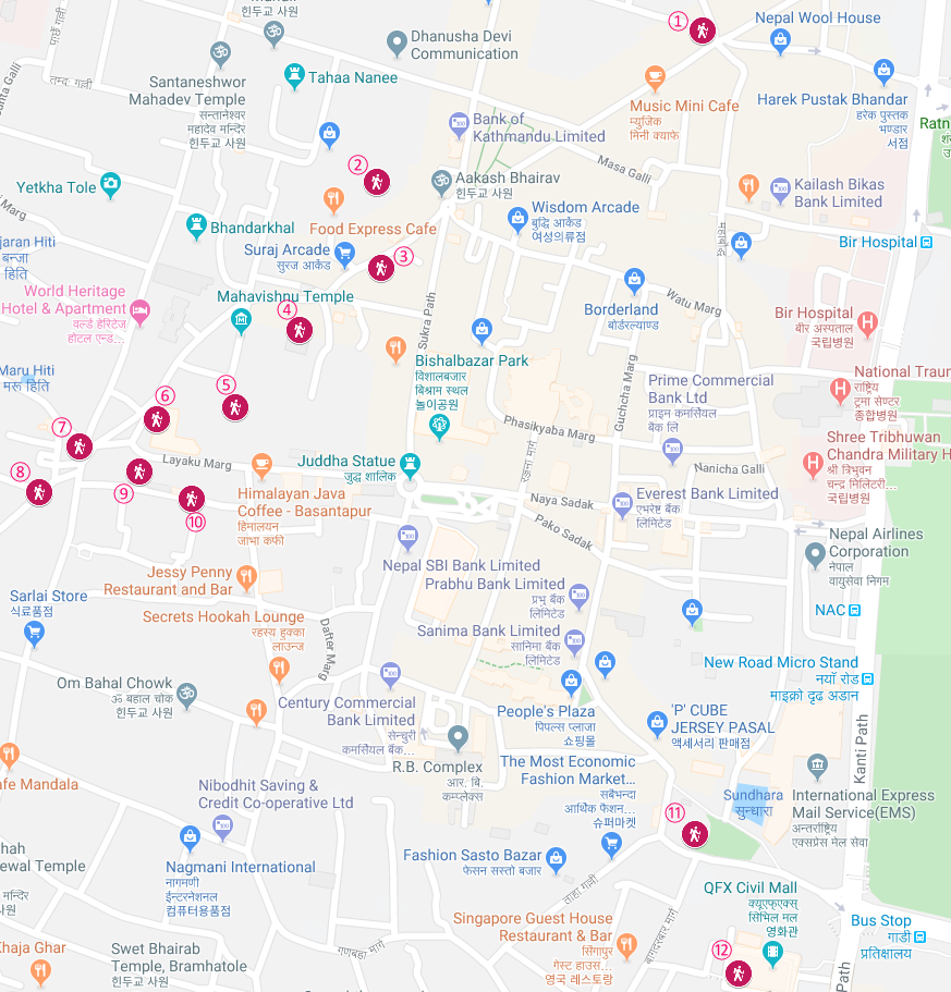 야간 버스가 카트만두에 도착하면 아마도 타멜 시내 중심가 호텔 밀집 지역에 내려줄 것 같은데 위의 지도 맨 꼭대기에 있는 아손 시장으로 시작하여 남서쪽으로 이동하며 주요 장소들을 돌아보고 동쪽 하단에 있는 시빌 몰(Civil Mall)에 걷기를 마무리합니다. 걷기를 마무리하면 쇼핑몰에서 늦어도 12:00에는 출발해야 합니다. 택시로 이동합니다. 다음은 걸으면서 들를 주요 장소들입니다.