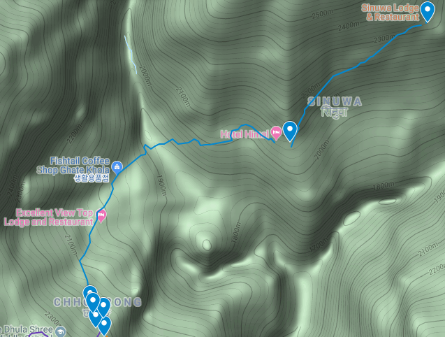 뱀부에서 촘롱까지는 9.19Km로 시누아까지는 무난하고 시누아에서 촘롱으로 갈 때 촘롱 계곡을 지나는 급한 내리막과 오르막이 고비입니다. 촘롱에서 묵을 숙소 후보는 다음과 같습니다.