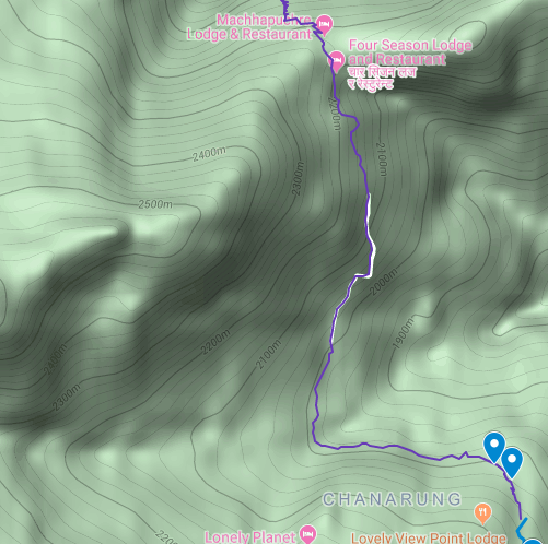 콤롱(Komrong) 고개를 지나면 킴롱(Kimrong) 계곡까지 400미터가량 급한 내리막을 걷다가 계곡을 지나 고도 2,300미터까지 500미터가량의 급한 오르막을 오릅니다. 일단 2,300미터까지 고도를 올리면 그다음부터 촘롱(Chhomrong)까지는 평탄한 길이 이어집니다. 콤롱 이후 급한 내리막과 다시 급한 오르막을 오르는 것이 2일 차의 고비가 될 것으로 보입니다.