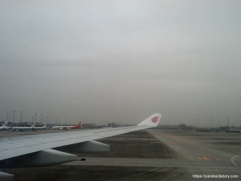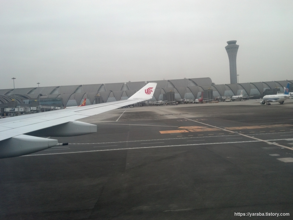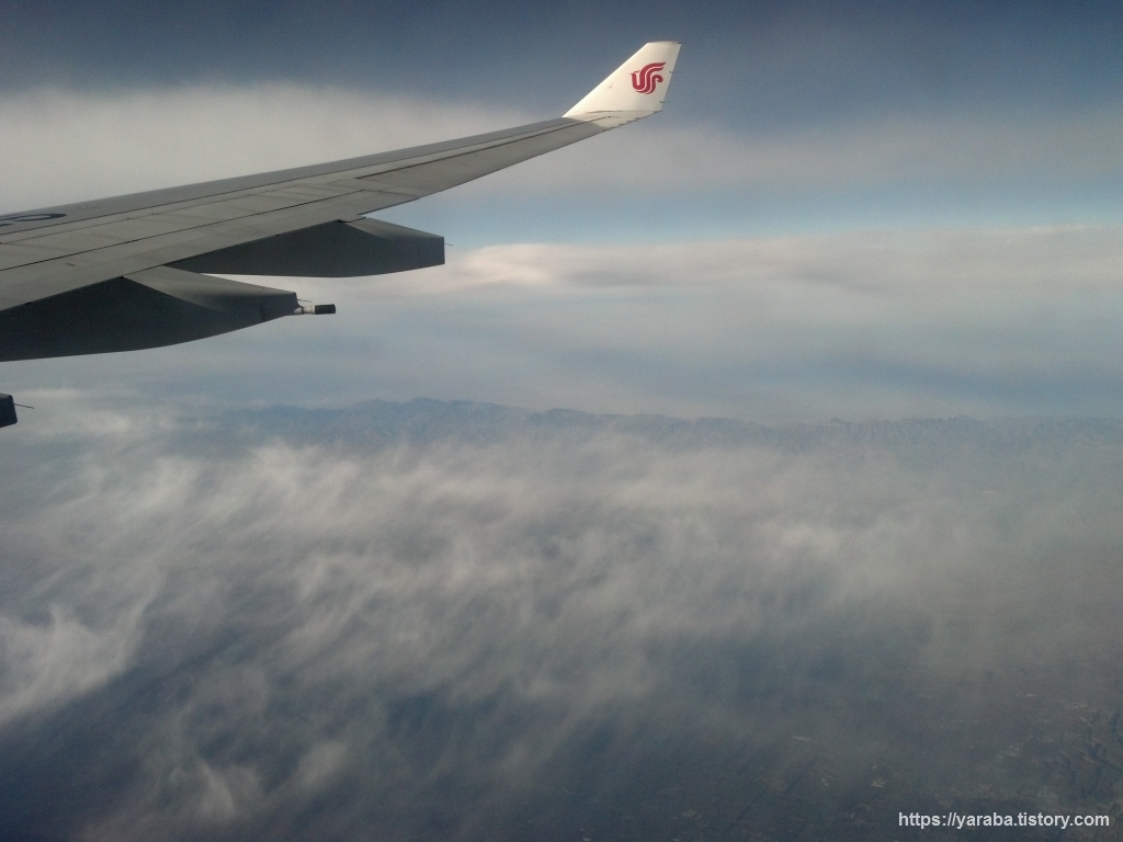 4시간여의 비행 끝에 비행기는 중국 청두 공항에 무사히 도착 했습니다. 중국에서 베이징과 청두는 도시화가 진행된 만큼 스모그로 골머리를 앓고 있는 대표적인 도시이죠. 저녁 시간이기도 하지만 하늘이 뿌옅습니다.
