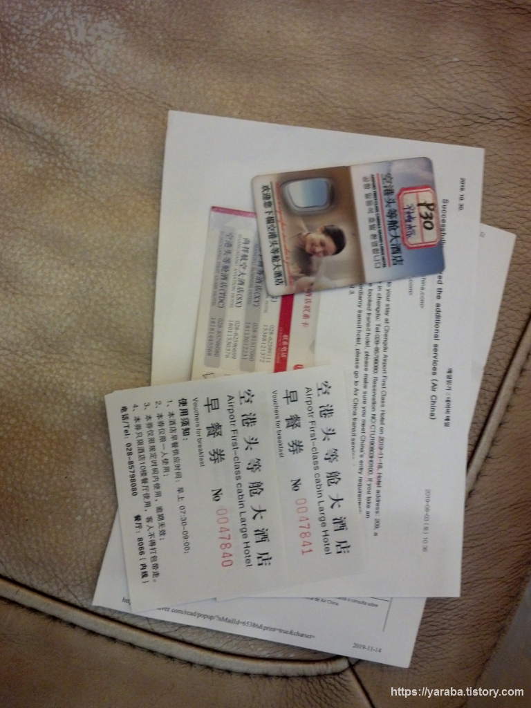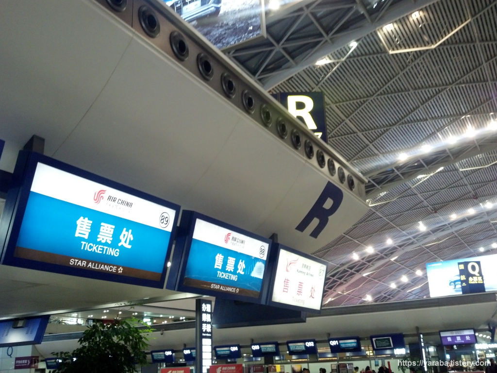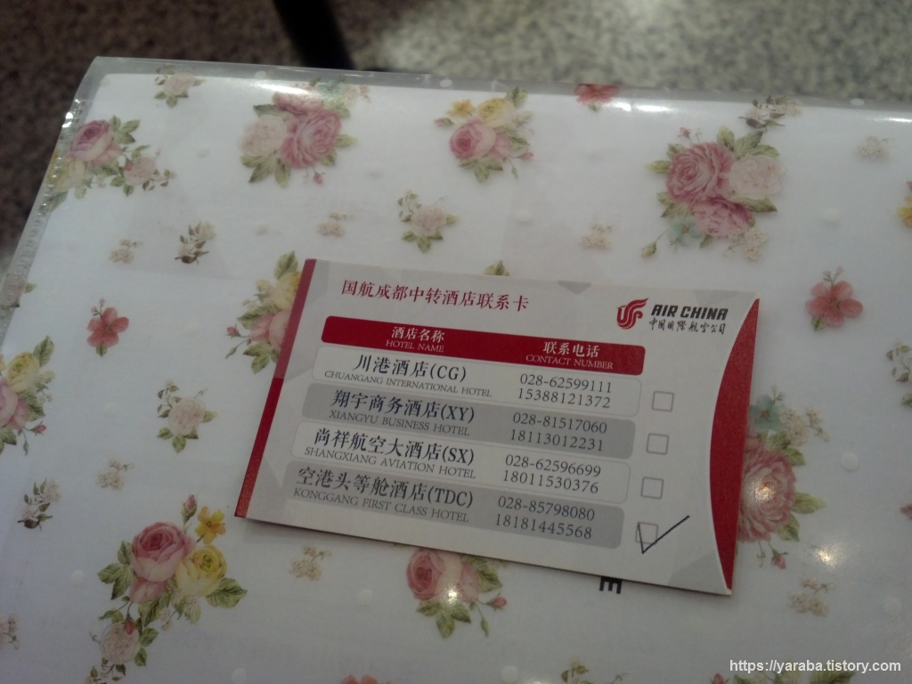 중국 청두를 거쳐서 네팔 카트만두로 가는 환승 비행기는 환승 대기 시간이 길기 때문에(청두 도착 다음날에 카트만두로 출발) 미리 무료 환승 호텔을 예약했습니다. 2년 전 파리로 갈 때의 경험을 생각하며 국내선인 청두 공항 2 터미널 출국장 R열에서 "Air China Transit Hotel Service"라고 적힌 창구를 찾아보았지만 그런 창구는 따로 보이지 않았습니다. 91번 창구에서 처리를 해주기는 하는데, 확실하지 않지만 환승 호텔을 미리 예약해 놓으면 청두 공항 1 터미널의 안내데스크에서 배정된 호텔에서 직접 나와서 저희 이름이 들고 서있는 모양입니다. 올 때, 갈 때 두 번 모두 청두 공항의 무료 환승 호텔 서비스를 받았는데 두 번 모두 호텔에서 나온 분이 저희 이름이 적힌 종이를 들고 있었습니다. 저희가 굳이 2 터미널로 이동할 필요가 없었던 것이었습니다. 기다리셨던 호텔분들에게는 미안하지만 아무런 안내가 없었으니 하는 수 없지요.