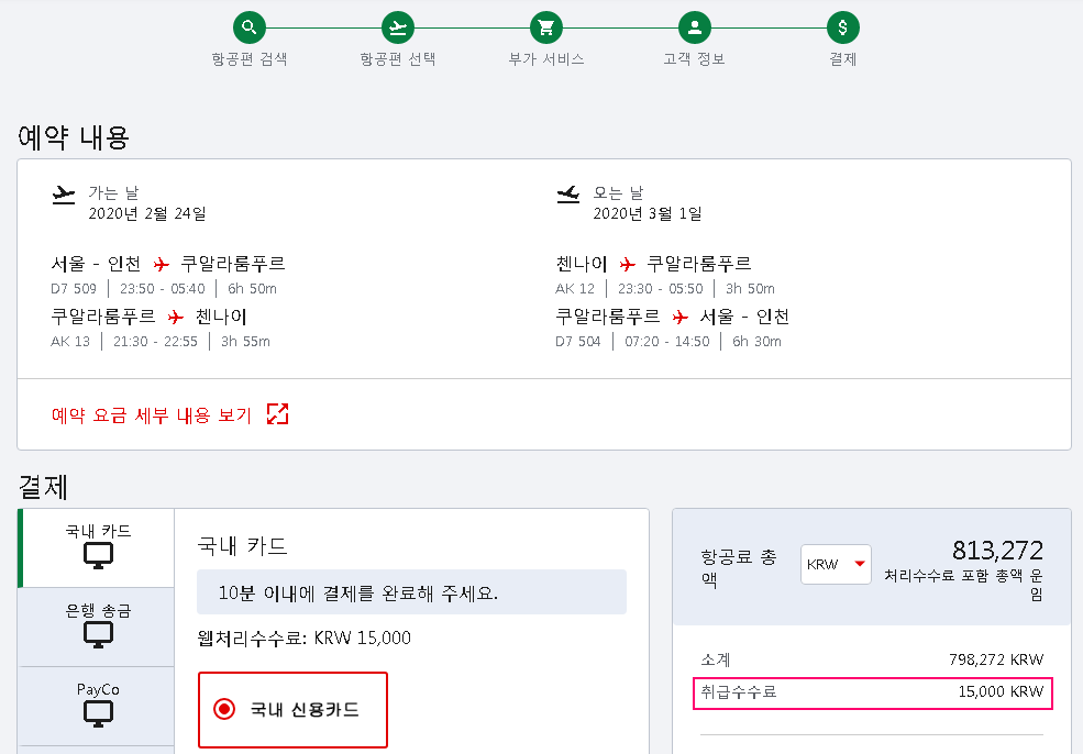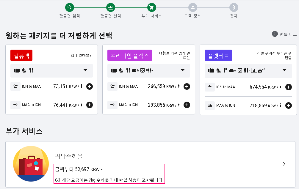 갈 때, 올 때의 항공편을 선택한 다음에는 수하물, 기내식, 좌석 선택등 다양한 부가 서비스를 선택하는 단계인데 저희는 위탁 수하물을 사용하지 않고 7Kg 이내의 기내 수하물만 가지고 가기로 했습니다. 기내식도 밤 비행기를 이용하는 항공편은 선택하지 않고 아침에 출발하는 쿠알라룸푸르에서 인천으로 돌아오는 항공편에서만 2인 식사를 신청했습니다. 각 개인별 필요에 맞게 이런 옵션을 선택하는 것이 실속파 여행자들에게는 딱이지 않은가 싶었습니다.
