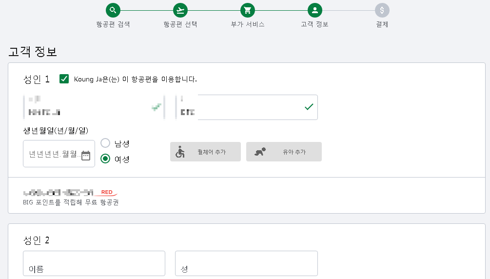 고객 정보 입력 단계인데 회원 가입하고 관련 정보를 미리 입력해 놓으면 이 단계나 나중에 체크인 시점에서 간편하게 일을 처리할 수 있습니다. 동승자도 회원 정보에 미리 등록해 놓을 수 있습니다.