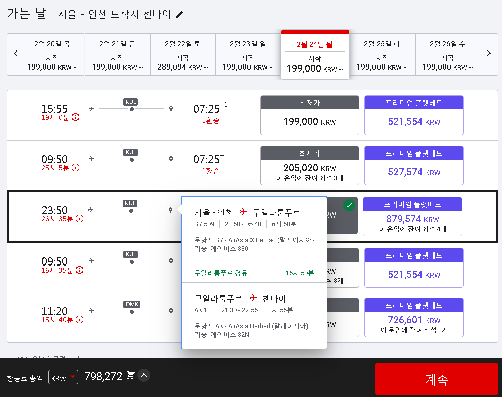 주말/평일 단위로 운행하는 항공편과 가격이 차이가 있으므로 본인 일정을 조정할 수 있으면 가격을 더 낮출 수 있습니다. 저희는 밤 비행기를 이용하기로 했습니다. 기내식 필요없고 그냥 자면 되므로 인천-쿠알라룸푸르, 쿠알라룸푸르-첸나이, 첸나이-쿠알라룸푸르 구간을 모두 밤 비행기로 이동하도록 선택했습니다. 인천에서 첸나이로 갈때는 쿠알라룸푸르에서의 환승 시간이 16시간에 가까울 정도로 넉넉하기 때문에 그 시간을 활용해서 쿠알라룸푸르 시내 걷기를 하고 다시 밤 비행기를 타고 첸나이로 건너오는 여정을 계획을 하고 있습니다. 대신 한국으로 돌아올 때는 1시간 30분 정도의 짧은 환승 시간을 적용하는 항공편을 선택했습니다.