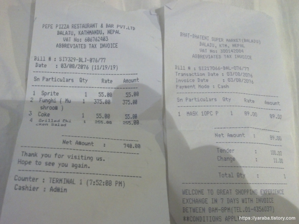 저희는 이 마트에서 따로 구입할 것은 없었고 마스크만 89루피를 주고 구입해서 사용했습니다. 네팔에서는 동전을 쓸 일이 없었는데 1루피짜리를 주려고 해서 동전은 받지 않겠다고 했습니다. 실제로 이후에는 한번도 동전을 쓸일이 없었습니다. 레스토랑에서는 버섯 피자 375루피, 치킨 샐러드 255 루피, 음료수 2개 110 루피 해서 총 740루피를 사용했습니다. 넉넉한 공간에서 여유로운 시간 사용과 먹을만한 음식과 휴식으로 나름 좋은 시간을 가졌습니다.