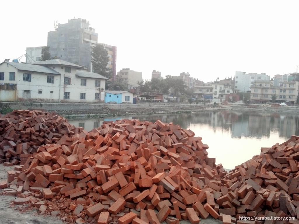 카말 포카리 호수는 2020년 네팔 방문의 해를 준비하며 한창 공사중인 모양이었습니다. 이곳의 공사는 우리나라처럼 후다닥 해치우는 것이 아니라 천천히, 답답할 정도로 느립니다. 호수 한쪽으로 벤치 비슷한 것들이 있었는데 호수 상태가 별로 였지만 잠시 앉아서 간식도 먹고, 물도 마신 다음에 나라얀히티 궁전 쪽으로 걸음을 옮겼습니다.