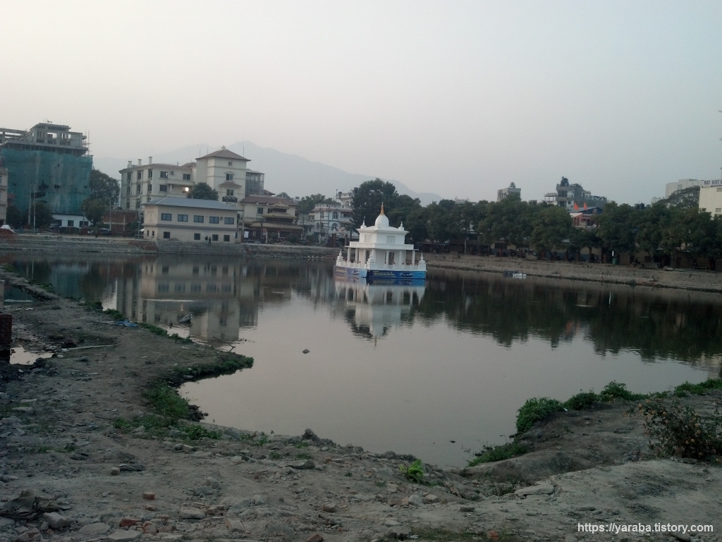 영화관 골목에서 나와 파슈파티 거리(Pashupati sadak)을 건너면 카말 포카리(Kamal Pokhari) 호수를 만날 수 있습니다. 오래전에 방치되었다가 지역주민과 유지들이 복원한 곳이라 하는데 저희가 방문할 당시에는 위의 그림처럼 물이 많이 빠져 있었습니다. 호수 한쪽에는 호수 복원에 힘쓴 인물의 동상도 있었습니다.