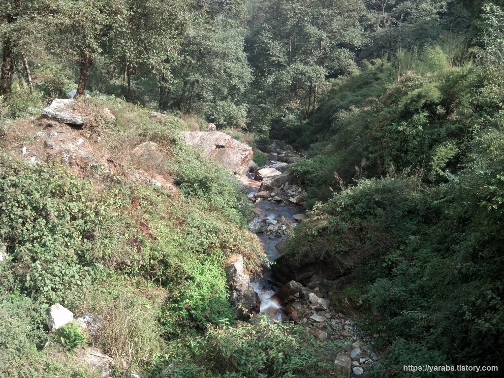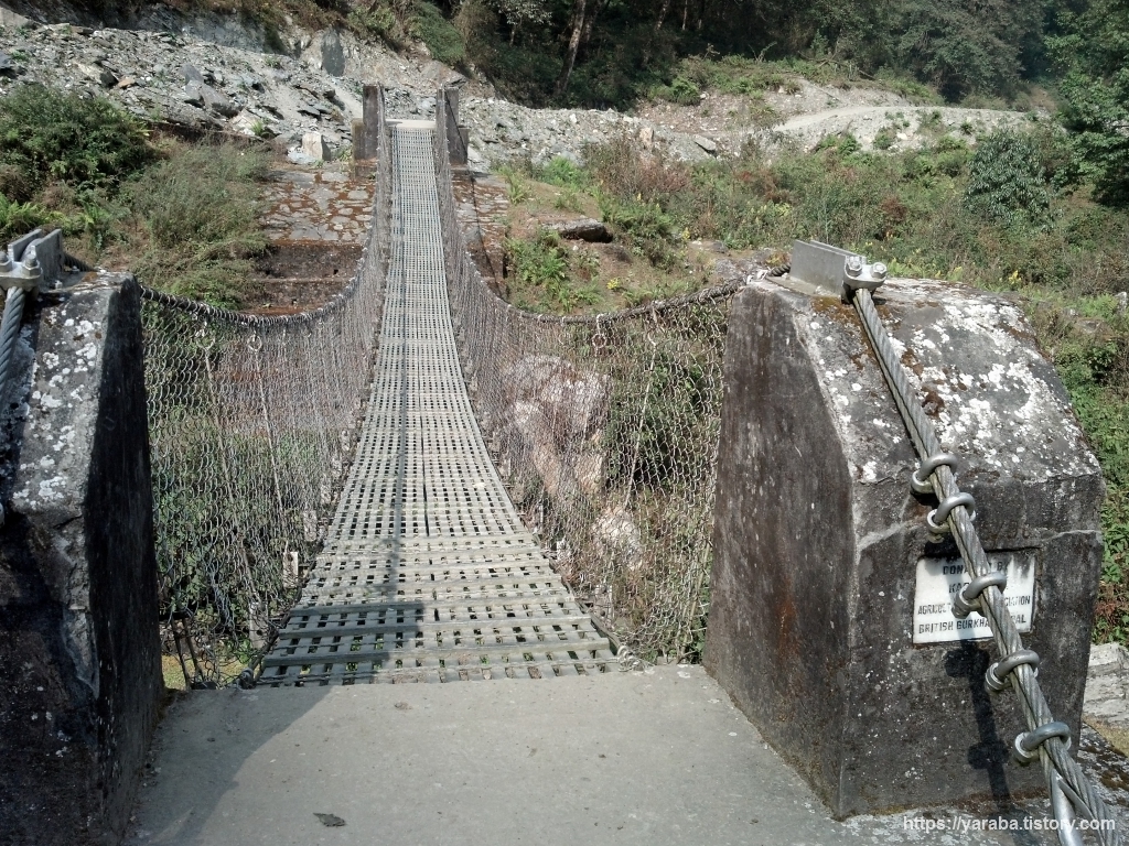 옆으로 우회로가 있기는 하지만 계곡을 가로지르는 다리를 통해서 계곡을 건넙니다. 히말라야에서 만나는 첫 다리였는데 길지 않은 다리였지만 다리가 후들거리더군요. 이번 여행에서 만나는 첫 다리였지만 앞으로 이것보다 훨씬 아찔한 여러 다리들을 곧 만나게 될 것입니다. 옆에 안전 난간도 있고 튼튼한 다리지만 아래가 숭숭 뚫려 있는 다리다 보니 고소공포증이 있는 사람은 건너기 어려울지도 모르겠습니다. 아무튼 ABC 트레킹 코스에는 이것보다 아찔한 다리들이 여러 개 있습니다. 때로는 다리를 건너다가 다리 가운데서 당나귀 무리와 마주칠 수도 있기 때문에 잘 살펴보고 건너야 합니다.