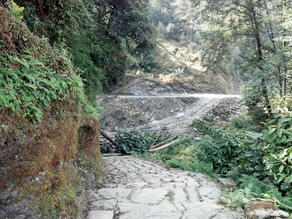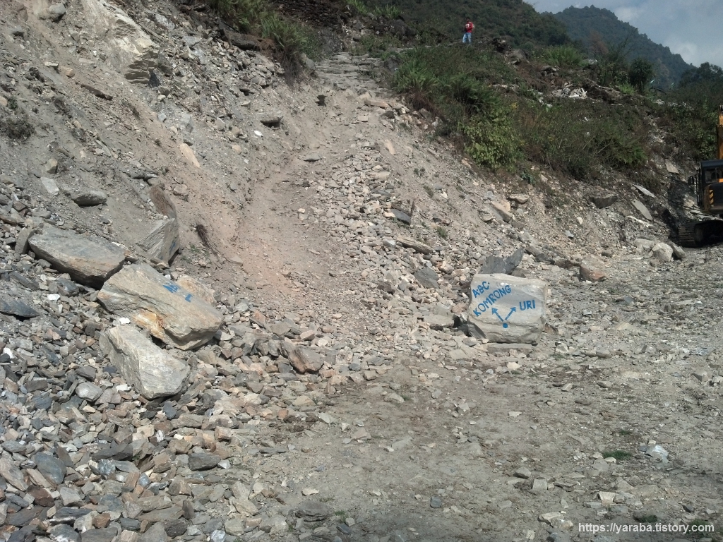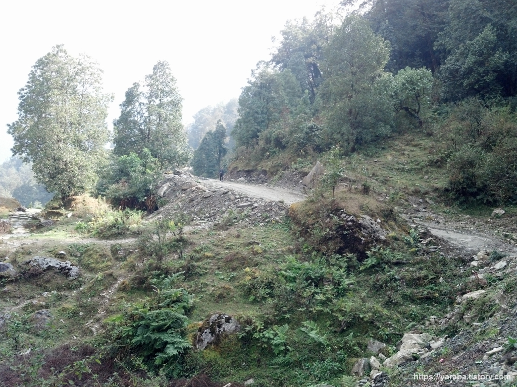 간드룩 버스 터미널을 지나 한참 동안은 큰길을 따라 걷습니다. 포장된 길은 아니지만 우리나라의 임도처럼 산을 깎아놓은 흙길을 따라 걸어도 예전에 사람들이 다니던 길과 크게 다르지 않습니다. 위의 그림처럼 가끔은 예전에 사람들이 다니던 길의 흔적도 있지만 큰길을 따라 계속 걷습니다.