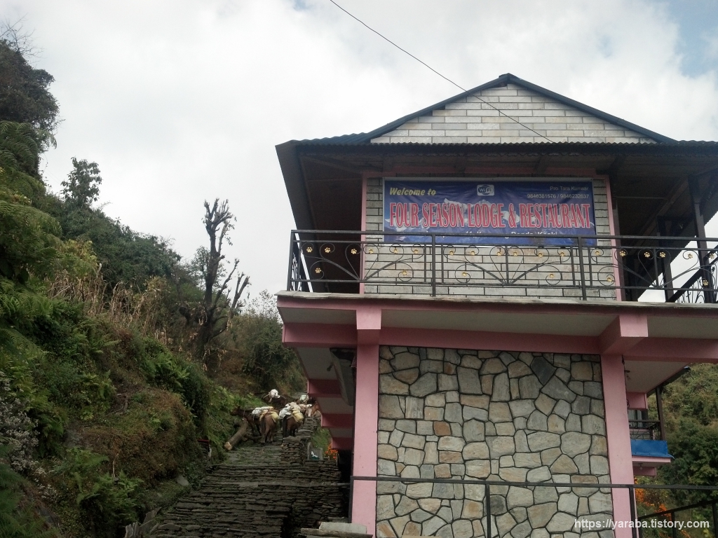 정오가 조금 지난 시각 저희의 첫 산장 경험은 포시즌 산장(Four Season Lodge & Restaurant)이었습니다. 전통 복장을 입은 인상 좋은 아주머니께서 반겨주시는 산장에서 점심을 해결하고 가기로 했습니다. 인상 좋은 아주머니와 이런저런 이야기를 나누며 즐거운 시간을 보낼 수 있었습니다. 영어 소통이 된다는 점이 ABC 트레킹의 장점이 아닌가 싶습니다.
