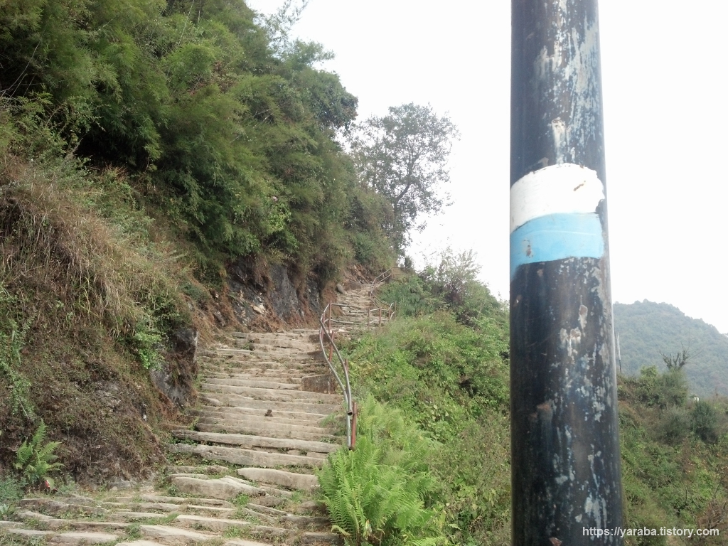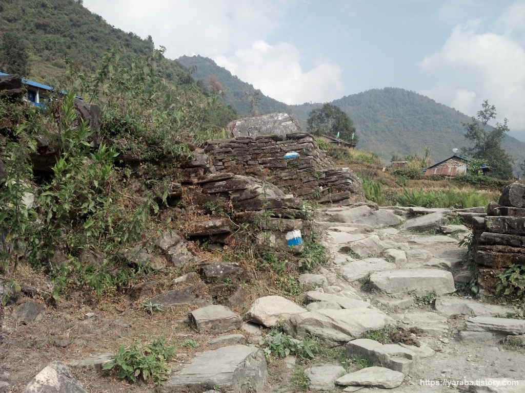 흰색, 파란색 두줄 표식이 이곳이 트레킹 코스 임을 명확하게 확인시켜 줍니다. 히말라야 ABC 트레킹은 끊임없는 계단과의 씨름으로 시작해서 계단과의 이별로 끝이 납니다. 기나긴 계단이 한눈에 보인다면 계단을 오르기 전에 벌써 지쳐 버릴 텐데 계단을 통한 오르막들은 조금씩만 그 정체를 보여 줍니다.