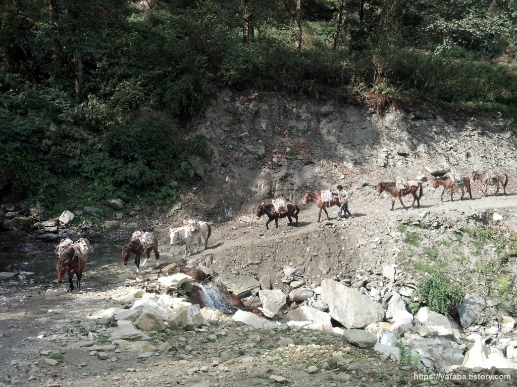 무거운 공사 자재를 등에 지고 길을 걷고 있는 당나귀들의 모습입니다. ABC 트레킹 중에 수없이 만날 친구들입니다. 조금 힘들어 보입니다.