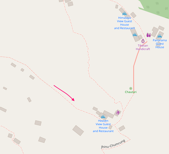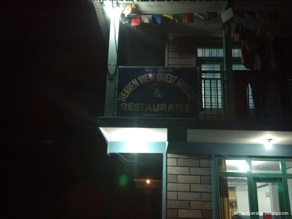 콤롱 고개(Komrong)와 킴롱 계곡(Kimrong Khola)을 거쳐서 촘롱(Chhomrong) 초입에 도착한 저희는 지누단다(Jhinu Danda)로 가는 길, 촘롱으로 가는 길, 킴롱 계곡에서 오는 길이 만나는 삼거리에 위치한 헤븐 뷰 게스트 하우스(Heaven View Guest House and Restaurant)에서 묵어 가기로 했습니다. 오전 11시에 간드룩 버스 터미널을 출발하여 오후 5시 정도에 산장에 도착했으니 간드룩에서 촘롱까지 6시간 가량이 소요되었습니다.