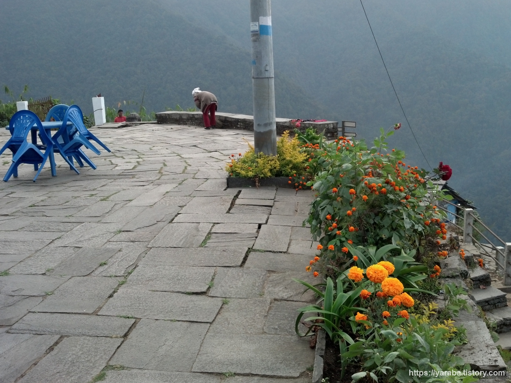 이곳 산장들은 방마다 난방 시설이 없지만 지난밤 챙겨간 경량 침낭과 숙소에 있는 두꺼운 이불 덕택에 저희는 넉넉하고, 편안한 히말라야에서의 첫날밤을 지낼 수 있었습니다. 추위를 많이 타는 옆지기는 뜨거운 물을 넣은 작은 온수통으로 핫팩을 대신했고, 다음날 산행동안 마실 물은 500ml 플라스틱 통 3개에 물을 받아 정수제로 미리 준비해 놓았습니다. 배낭을 챙겨서 식당으로 내려오니 오전 7시인데도 이미 인증숏을 남기고 산행을 시작하는 팀도 있었습니다. 주인아주머니는 작은 향을 피워 간단한 의식을 치르시더니 산장 앞마당을 정성스레 쓸고 계셨습니다. 산장 주변으로 화초를 심어 놓으신 정성이 보입니다.