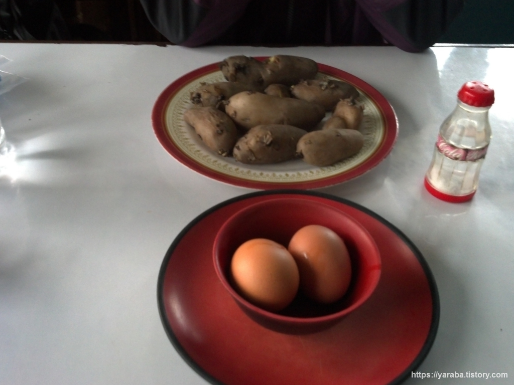 아침 식사는 찐 계란 두개(230 루피)와 찐 감자(300 루피)와 어젯밤 보온병에 만들어 두었던 따스한 둥굴레차로 가볍게 먹었습니다. 조금은 서늘한 날씨에 따뜻한 계란과 감자, 둥굴레 차로 식사를 하니 나름 괜찮았습니다.