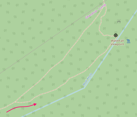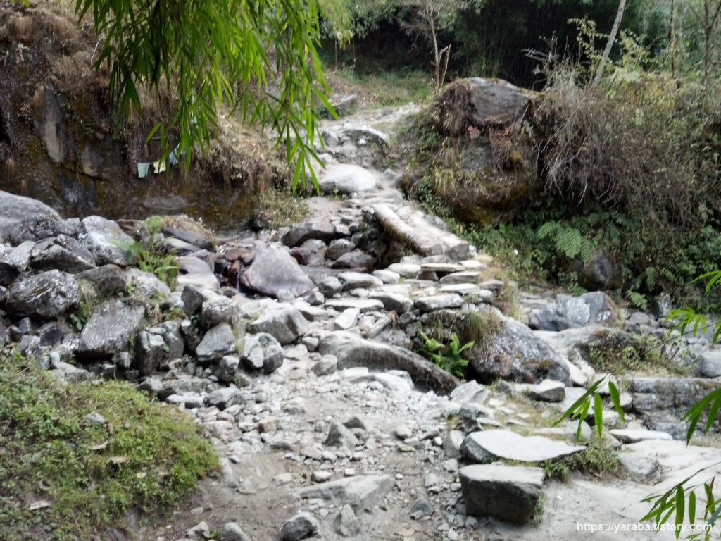 작은 계곡을 지나면 갈림길이 나오는데 저희는 폭포가 있는 쪽을 선택했습니다. 촘롱 이후의 ABC 트레킹은 지도나 GPS 어플이 없어도 목적지까지 걷는데 아무런 지장이 없지만 가끔씩 나오는 갈림길에서는 어디로 가야 하나 주저하기 마련입니다. 그렇지만 대부분의 갈림길 들은 잠시 후면 다시 만나기 때문에 어느 쪽을 선택해도 대세에는 지장이 없었습니다.