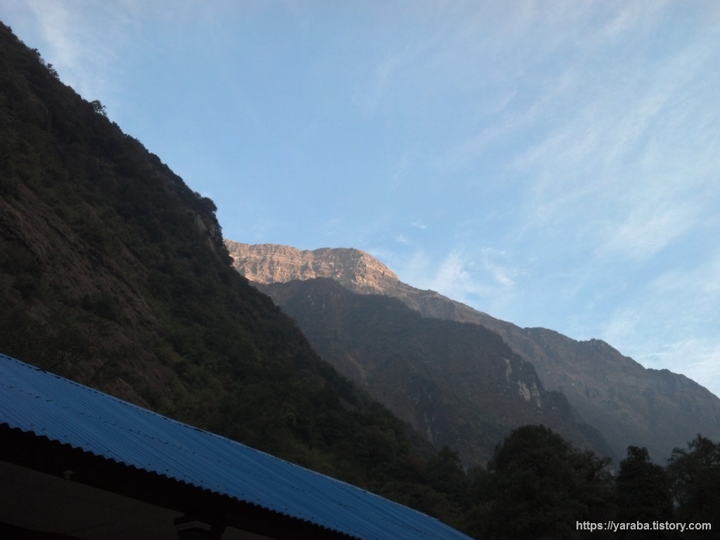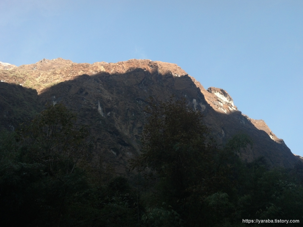오전 8시가 넘어가는 시간, 산 그림자가 산 아래로 조금씩 더 빠르게 내려오고 있고 계곡 저편 우측의 마차푸차레도 점점 더 밝게 보이며 숲길을 걷는 걸음에 이따금씩 상쾌한 풍경을 전해 줍니다.