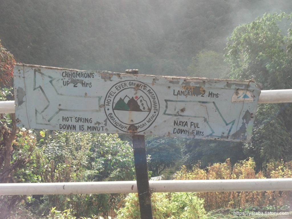 헤븐 뷰 게스트 하우스 앞은 간드룩, 지누단다, 시누아 및 촘롱으로 갈라진 삼거리로 첫날에는 시누아로 향했었죠. 이제는 지누단다, 지누 온천을 향해서 걷습니다.