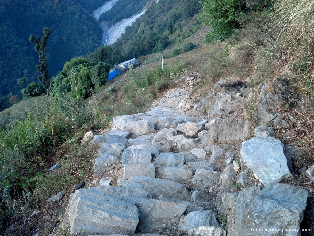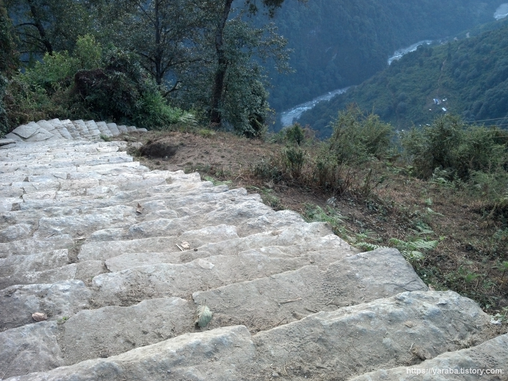 노천 온천이 있는 지누단다(Jinu Danda)를 거쳐 톨카(Tolka, 1,700m)까지 걷는 10Km가 넘는 여정을 시작합니다. 촘롱을 떠나 지누단다까지 내려가는 길은 700미터의 고도를 내리는 급한 내리막입니다. 많은 사람들은 이 길을 걸어 올라가지만 저희는 내려가기만 하네요. 이 길을 올라간다면 진을 빼는 코스겠지만 가벼운 발걸음으로 하루를 시작할 수 있겠습니다.