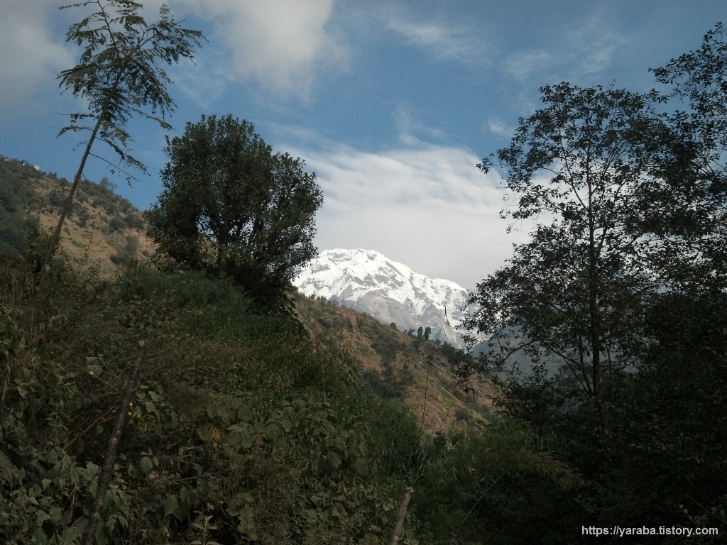 이제는 촘롱 고개가 거의 보이지 않을 정도로 계곡 아래로 내려왔습니다. 계곡 아래로 내려오니 거의 보이지 않았던 안나푸르나 남봉도 눈에 들어옵니다.