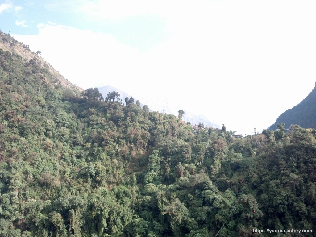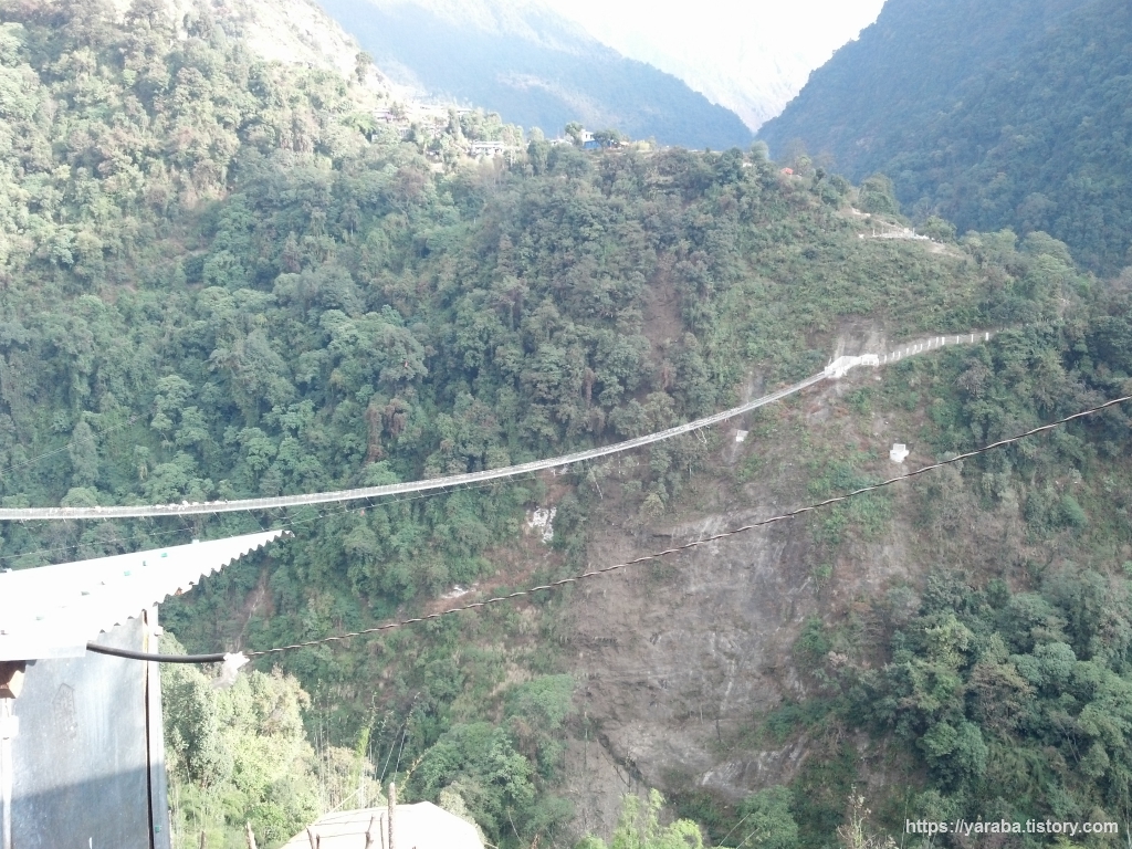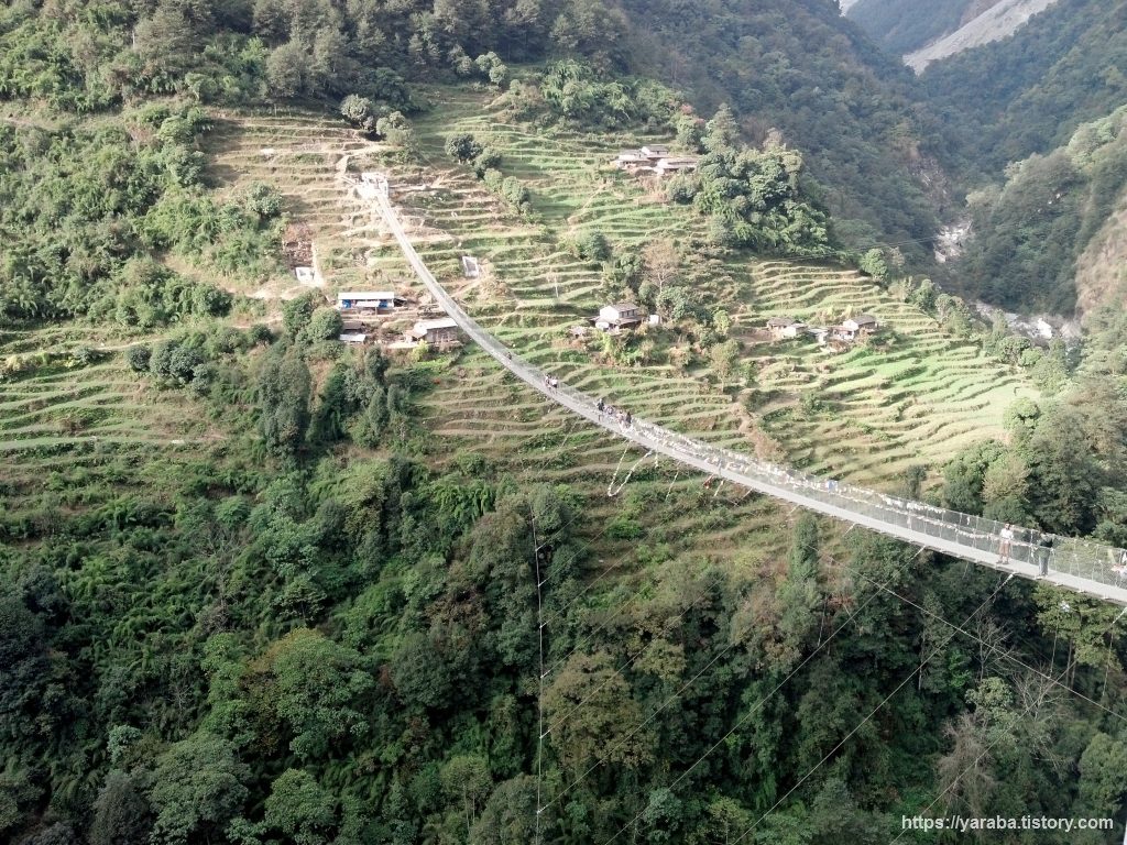 지누단다에 도착하면 트레커들을 기다리고 있는 것은 287미터에 이르는 거대한 출렁다리입니다. 엄청난 계곡을 가로지르는 다리는 워낙 다리가 길다 보니 다리 자체로도 내리막과 오르막이 있었습니다. 아래가 뻥 뚫린 철제 다리는 비가 올 때면 미끄러워서 공포감이 극대화되겠구나 싶었습니다.