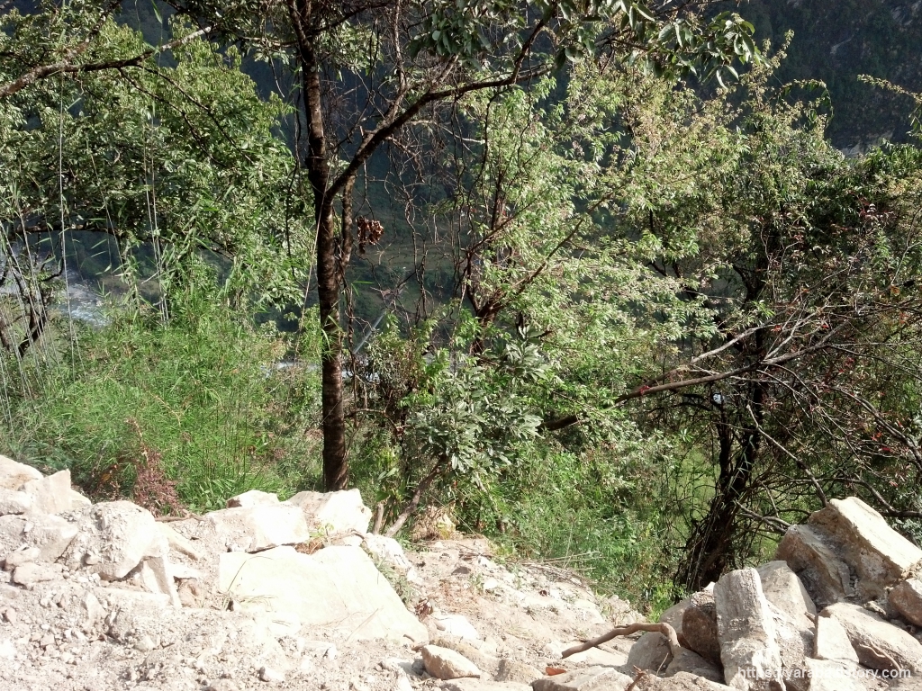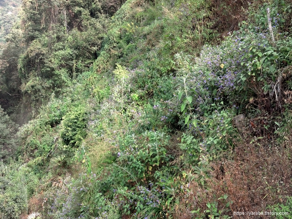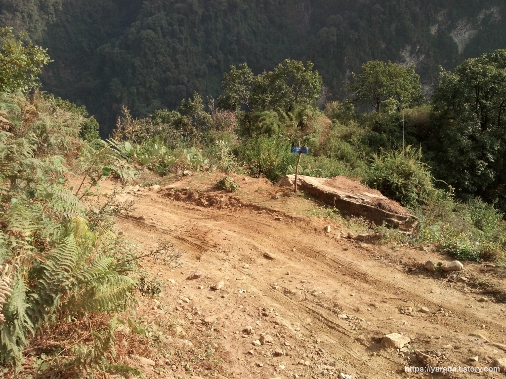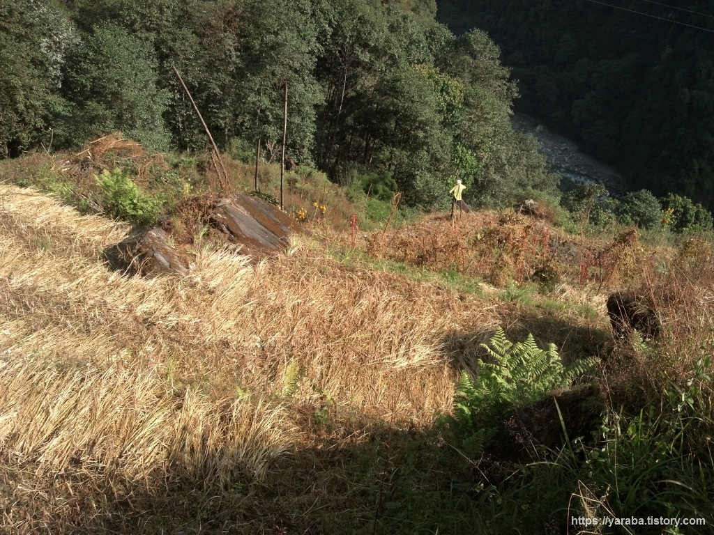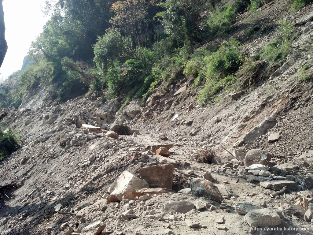 그렇게 멋모르고 산을 깎아 만든 흙길을 얼마간 더 걸었을까요? 좀 더 다듬어진 길이 시작되는 부분에 현지인들이 쪼그리고 앉아 뭔가를 기다리고 있었습니다. 처음에는 트래커들을 상대하는 장사치들인가 싶었는데, 자세히 보니 물건을 팔고 있는 것은 아니었습니다. 저희에게 어디로 가냐고 물었습니다. 란드룩을 거쳐 톨카로 간다고 하니 이 길이 아니라는 것입니다. 이길로 가면 간드룩이 나온다는 것이었습니다. 그제야 길이 왜 계곡을 따라가지 않고 산 중턱으로 올라왔는지 제대로 깨닫게 된 것입니다. 물론 정확한 현 위치 파악과 문제 해결 방법은 몰랐지만 길이 잘못되었다는 것은 확실하게 깨달은 것입니다. 그분들은 그곳까지 오는 버스를 기다리고 있는 것이었습니다. 방향이 맞다면 타고 가라고 길을 물어본 것이지요. 나중에 파악을 해보니 이 길을 계속 가면 나야풀에서 간드룩으로 올라가는 길 초입과 만나는 길이었습니다. 버스를 기다리고 계신 분들은 저희가 란드룩과 톨카를 간다고 하니 난감해하시더군요. 길이 잘못되었다는 것을 알았을 때 저 아래로 보이는 계곡을 향해서 길을 없더라도 그냥 뚫고 내려가고도 싶었지만 무모한 도전을 감행하기에는 엄청난 절벽이었습니다.