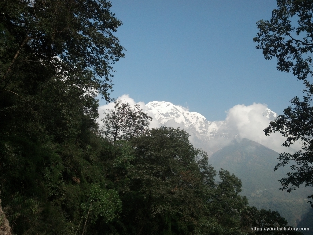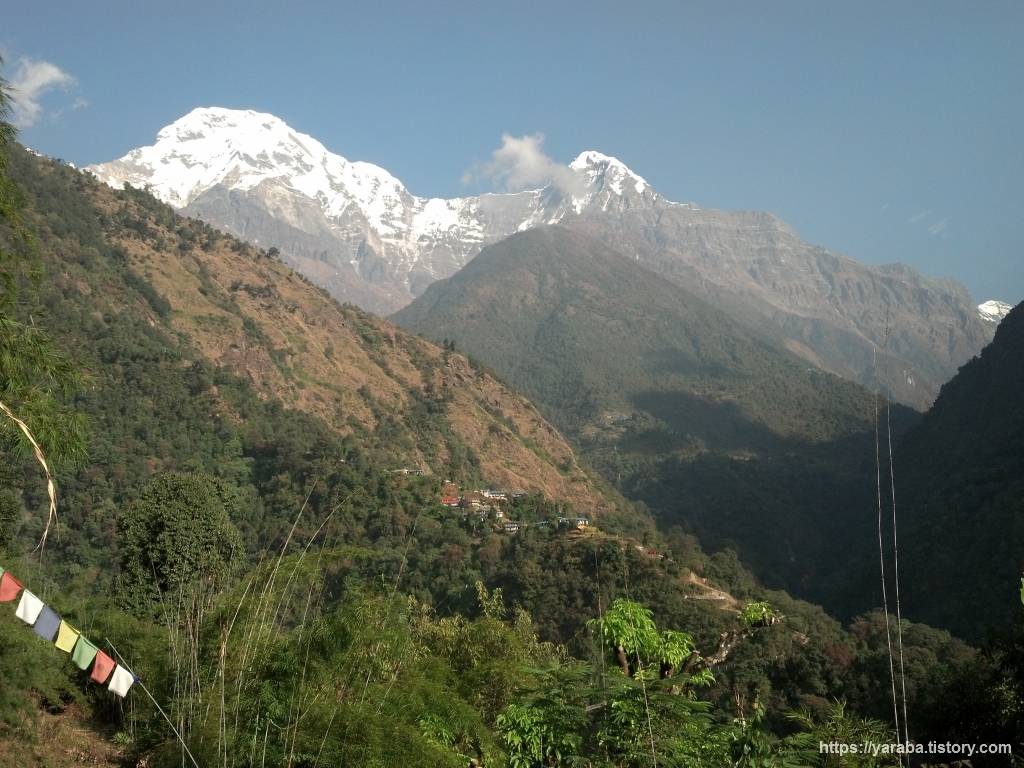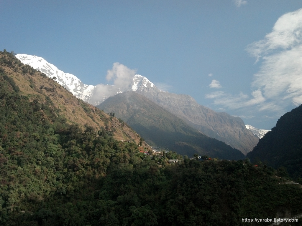 산 중턱에 해당하는 높이에 오르자 산 기슭에 자리한 지누단다와 함께 멀리 안나푸르나 남봉을 배경으로 한 멋진 풍경이 펼쳐집니다. 사실 촘롱 이후 MBC를 지나 ABC 근방에 이를 때까지 계곡을 따라가는 경로에서는 안나푸르나 남봉은 시야에 들어오지 않습니다. 가끔 보이는 것은 마차푸차레 뿐입니다. 오히려 멀리 떨어지니 봉우리가 아름다운 모습으로 다가오는군요.