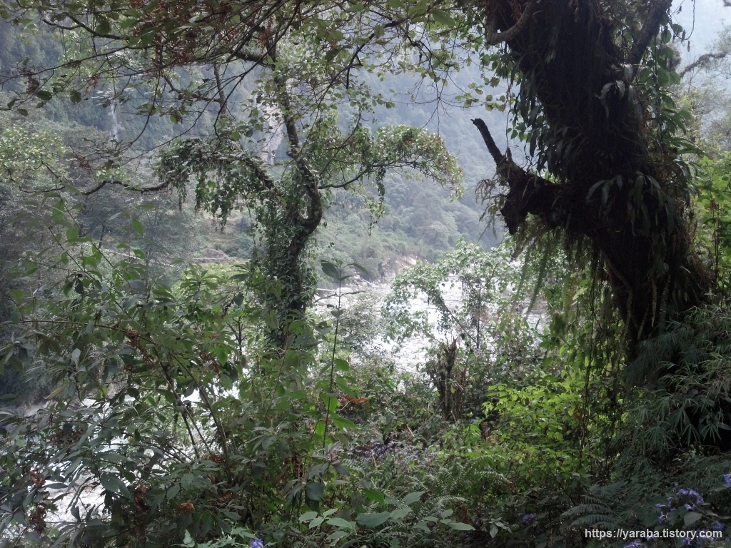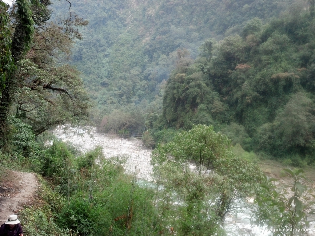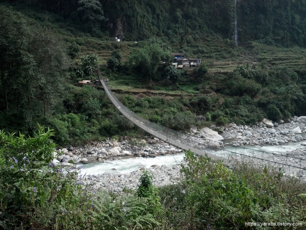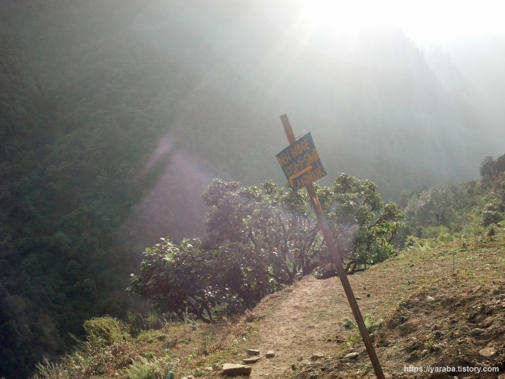 다리 끝에서 우리(Uri), 간드룩(Ghandruk), 뉴 브리지(New Bridge)로 가는 세 갈래 길이 있고 일단 각 갈래 길로 들어서면 완전히 다른 방향으로 가기 때문에 길을 잘 선택해야 했던 것을 몰랐던 것입니다. 표지판처럼 다리를 건너면 뒤로 돌아서 다리 아래 길로 갔어야 했던 것입니다. 그걸 모르고 앞선 인도인 친구들을 쫓아갔던 것이 패착이었습니다. 그 당시에는 긴 다리를 건넌 흥분감에 길을 잘못 가는 줄도 모르고 가벼운 발걸음으로 길을 걸었습니다.