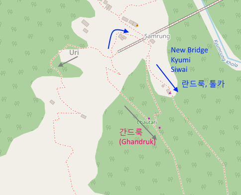 저희가 길을 헤맨 과정을 돌아보면 위의 그림과 같습니다. 간드룩을 통해서 톨카, 페디를 걷는 경로를 포기하고 포카라로 돌아갈 수밖에 없었던 상황에서 지금도 지도에 없는 길을 네팔 소년을 통해 걷다가 우연히 발견한 사람 흔적을 찾아 계곡 쪽으로 내려와서 길을 찾은 것입니다. 정상적이라면 뉴 브리지 마을에서 강을 건너서 길을 갔을 것입니다. 이 정도에서 길을 찾았으니 정말 다행이었습니다.
