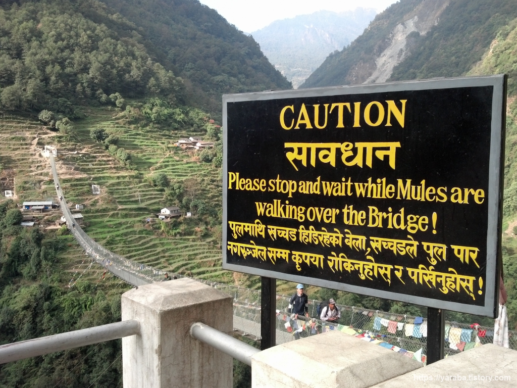 트래커에게도 도움이 되겠지만 현지인들을 위한 다리인 만큼 다리의 이용자는 사람뿐만 아니라 짐을 나르는 당나귀도 있습니다. 다리 앞에 있는 표지판이 인상적입니다. 당나귀가 다리를 건너고 있을 때는 멈추어서 당나귀가 다리를 모두 건널 때까지 기다리라는 안내입니다. 아무 생각 없이 다리를 건너다가 다리 중간에서 당나귀를 마주치는 장면은 상상만 해도 아슬아슬한 장면입니다. 실제로 나귀를 모는 마부는 사람이 없을 때를 골라 당나귀들을 몰아서 다리를 건너더군요.