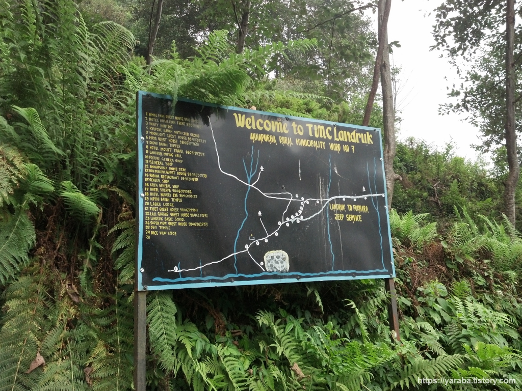 란드룩의 여러 산장들을 안내하고 있는 표지판입니다. 엄청나게 많은 산장들은 촘롱만큼이나 이곳이 트래커들의 주요 경유지임을 알게 해 줍니다. 란드룩은 계곡 건너편 간드룩을 통해서 넘어올 수도 있고, 페디나 칸데처럼 포카라로 이어지는 지점과 연결되므로 요충지임에는 틀림없습니다. 그렇지만 저희는 목표지인 폴카까지 길을 이어 갑니다.