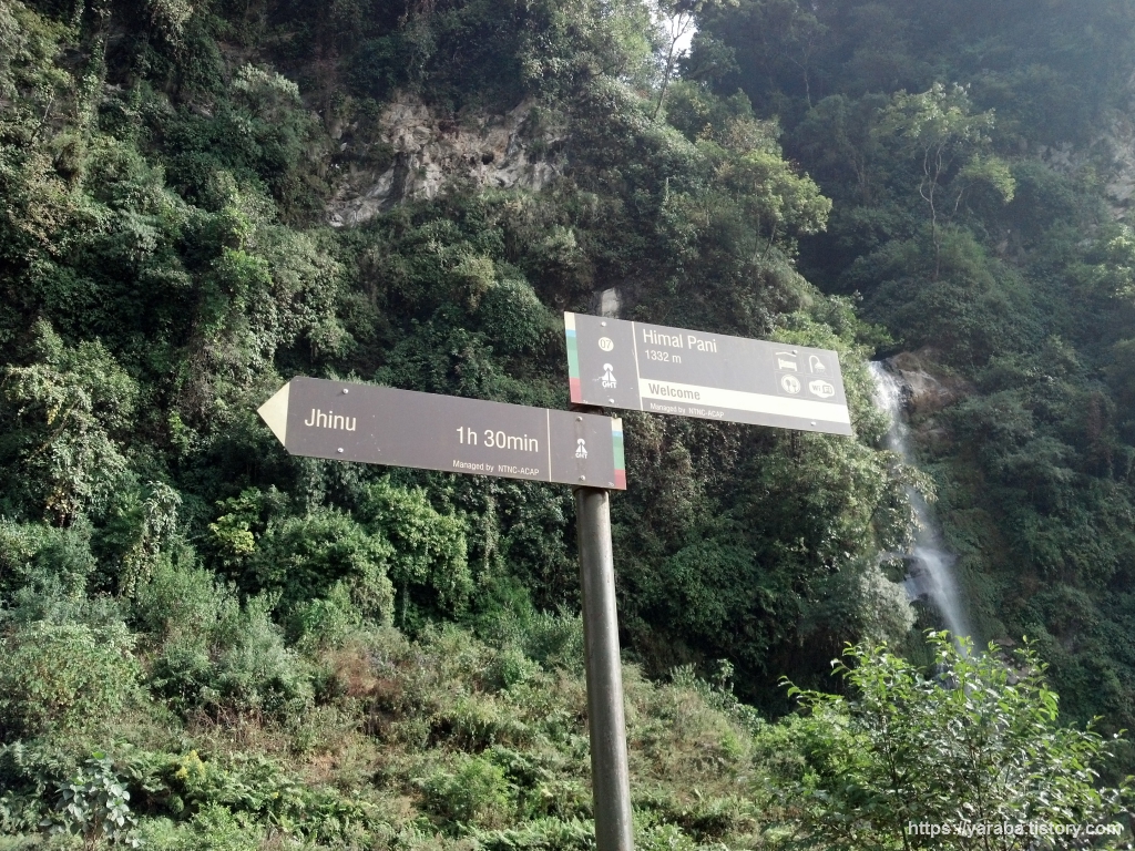 히말 파니(Himal Pani, 1,332m) 표지판. 지누까지 1시간 30분이니 저희가 길을 헤매긴 했어도 아주 많이 헤맨 것은 아니었습니다.