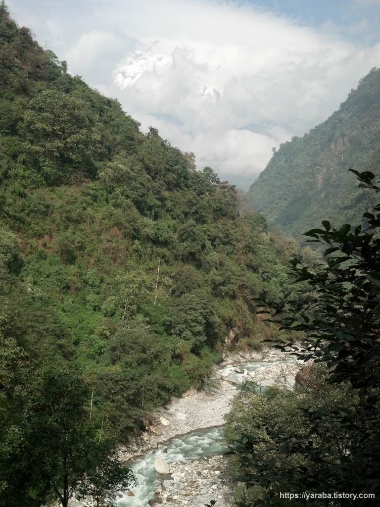길을 걷다가 가끔씩 계곡 가까이로 길이 붙을 때면 저희가 걸어 내려온 계곡 위쪽의 시야가 열립니다. 날은 맑지만 흰구름이 주변을 감싸고 있는 안나푸르나 남봉의 모습이 신비감을 자아냅니다.