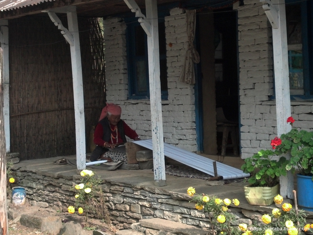히말 파니의 아름다운 마을 풍경만큼이나 산장에서는 저희의 눈길을 사로잡는 것이 많았습니다. 그중에 하나 전통 방식으로 천을 짜고 계신 할머니의 모습이 보기 좋았습니다. 옆지기는 할머님에게도 초코바를 선물했다고 하더군요.