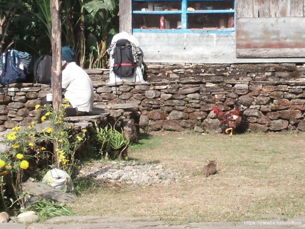 음식을 기다리고 있는데 새끼 고양이와 수탉 한 마리가 저희의 웃음을 자아냈습니다. 마치 호랑이가 사냥하듯이 뻔히 보이는 거리에서 닭을 주시하며 한걸음 한걸음 전진하는 새끼 고양이나, 뻔히 보이는데도 그것에는 아랑곳하지 않는 수탉도 지친 저희에게 웃음을 선물로 주었습니다.