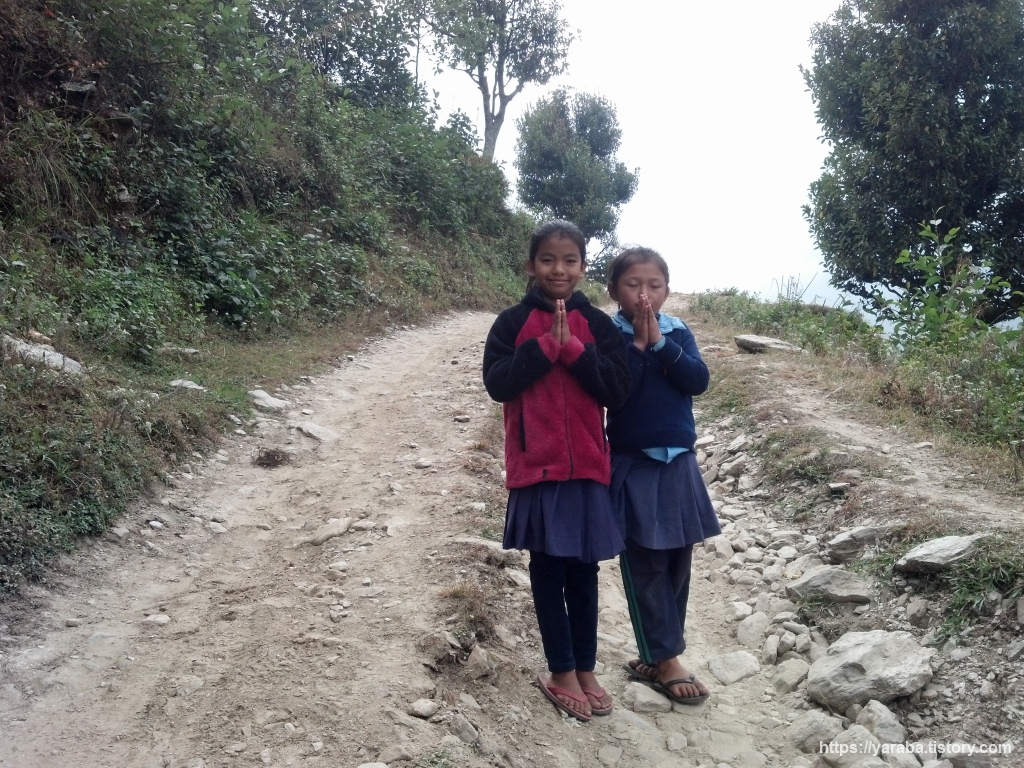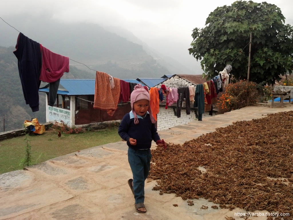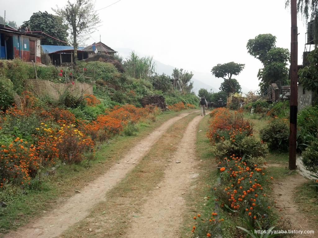 길 양쪽으로 꽃이 심어진 예쁜 길입니다. 이제는 자동차가 들어올 수 있는 길로 접어들었습니다. 란드룩까지 버스가 들어오기는 하지만 출발지와 시간은 알 수 없었습니다. 다만, 카트만두나 포카라에서 지프로 직접 란드룩까지 와서 트레킹을 시작하는 사람들도 있는 모양이었습니다. 이제부터는 이런 큰길이 포카라까지 이어진다고 해도 과언이 아니긴 합니다. 이후로는 대부분의 경로가 차량이 들어올 수 있는 구간입니다. 이 길에서 동네를 배회하는 소들을 만났는데 앞서 가시던 분이 소들 때문에 깜짝 놀라시는 일이 있었습니다. 그런데, 잠시 후에 그 소들을 쫓아가는 소 주인이 다름 아닌 어린 소녀였습니다. 초등학생 정도의 여자 아이가 막대기 하나 들고서 씩씩거리며 소를 몰러 가는 모습이 재미있었습니다.