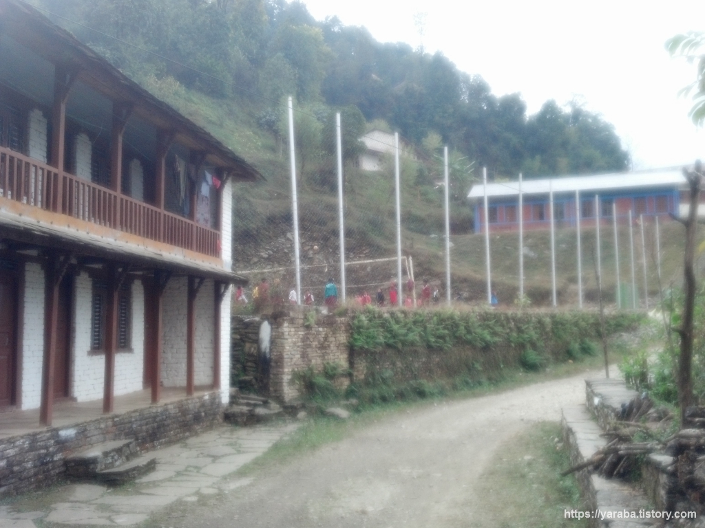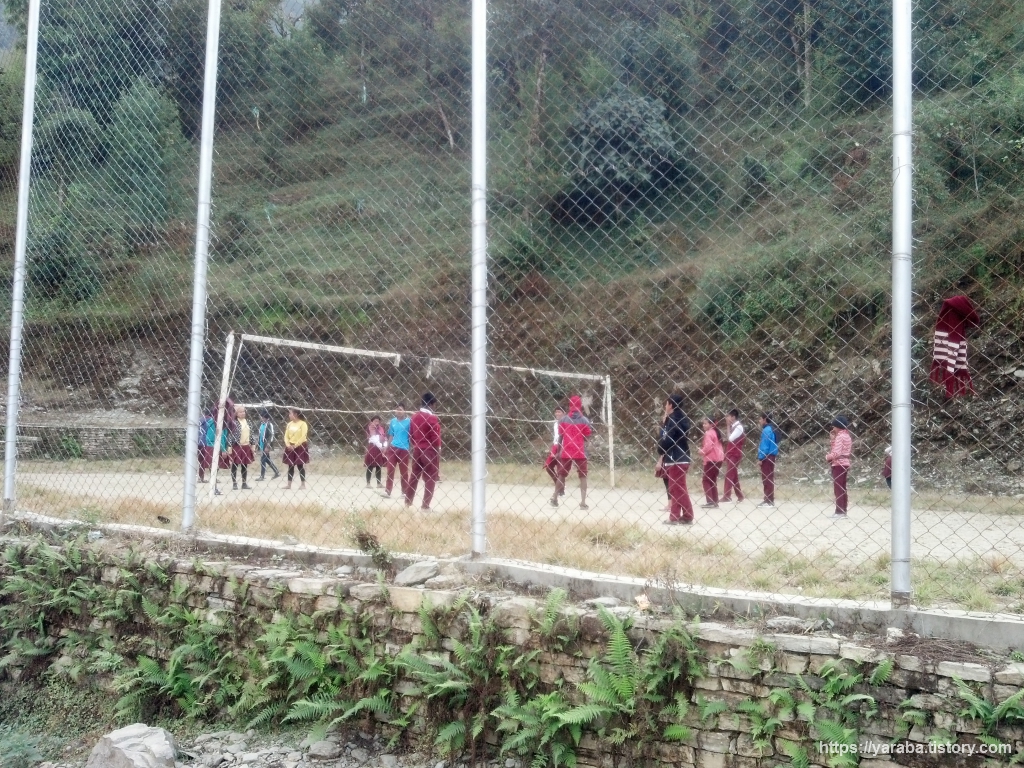 히말라야 중학교 학생들이 선생님과 함께 배구 수업을 하고 있는 모습입니다. 란드룩 초입에도 마을 공동의 야외 배구장이 있었는데 이곳에도 배구장이 있었습니다. 이거 뭔가 있구나 하고 자료를 찾아보니 네팔은 2017년에 배구를 나라의 스포츠, 즉 국기(國技)로 선언했다고 합니다. 실내 체육관처럼 화려하게 공간을 마련하지 않아도 작은 공간으로도 큰 비용 들이지 않고 청소년들이 스포츠를 즐길 수 있으므로 나라 차원에서 배구를 국기로 선언했다는 것입니다. 우리나라 같으면 세계적인 랭킹을 높이거나 대회 우승에 온 신경을 쏟지만 최우선으로 국민의 건강을 위한 배구의 국기 선언은 참 잘했다는 생각이 들었습니다. 배구를 나무 바닥이 깔린 실내 체육관에서만 하란 법은 없으니까요. 한 가지 드는 우스운 생각은 힘센 친구가 잘못해서 공을 세게 쳐서 울타리를 넘기면 공 찾기가 쉽지 않겠다는 것입니다. 이 산중에서 동그란 배구공이 얌전히 있을 리가 만무하니까요.