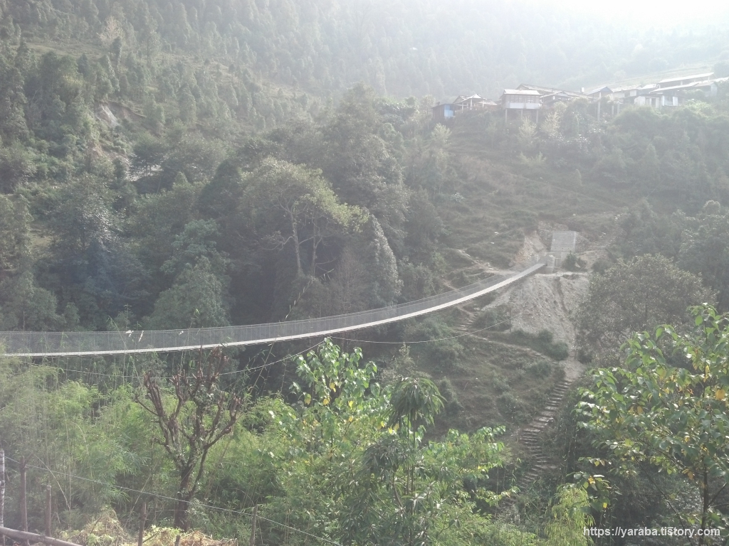 출렁다리에 올라서면 아래로 이전에 사용하던 다리와 계단들을 볼 수 있습니다. 새 출렁다리로 길이 더 단축된 것입니다. 계단을 올라 톨카 마을로 진입합니다.